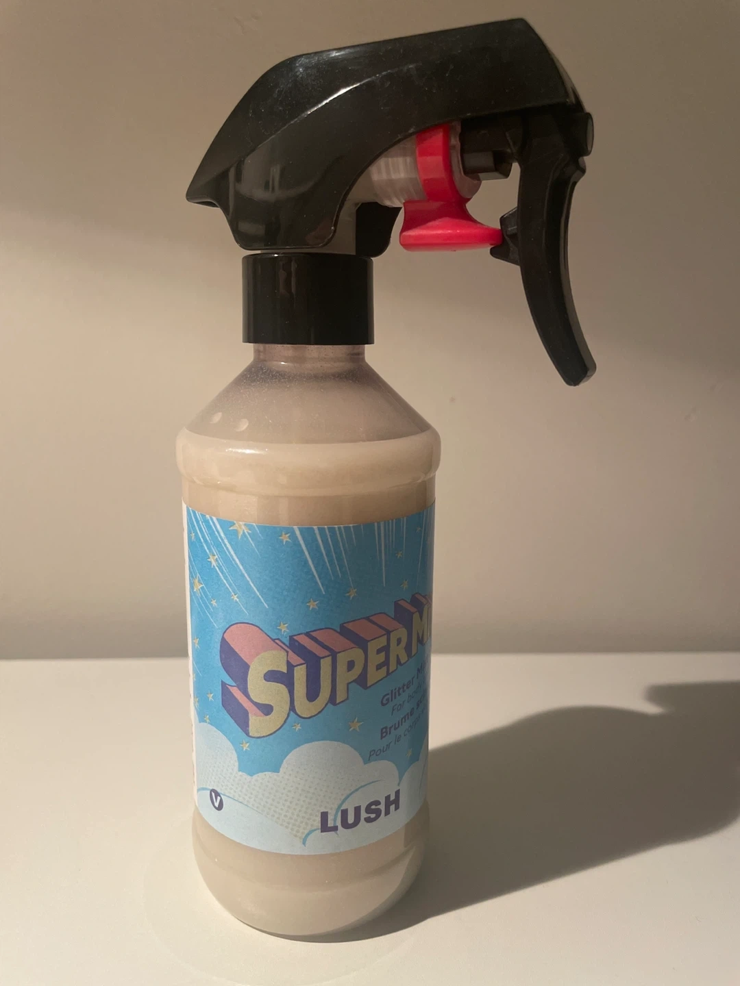 LUSH Supermilk Glitter Body Spray for body. It's a glitter mist, perfect for adding some sparkle. The bottle has a spray nozzle for easy application.