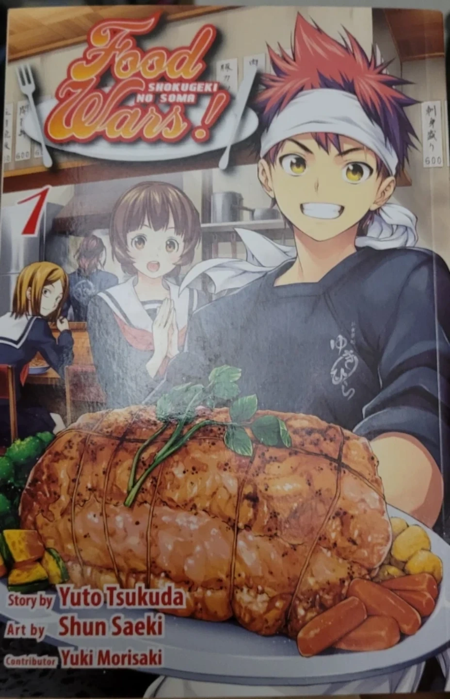 Food Wars! Shokugeki no Soma manga, volume 1. Story by Yuto Tsukuda, art by Shun Saeki, and contributor Yuki Morisaki. This volume covers the early culinary adventures.