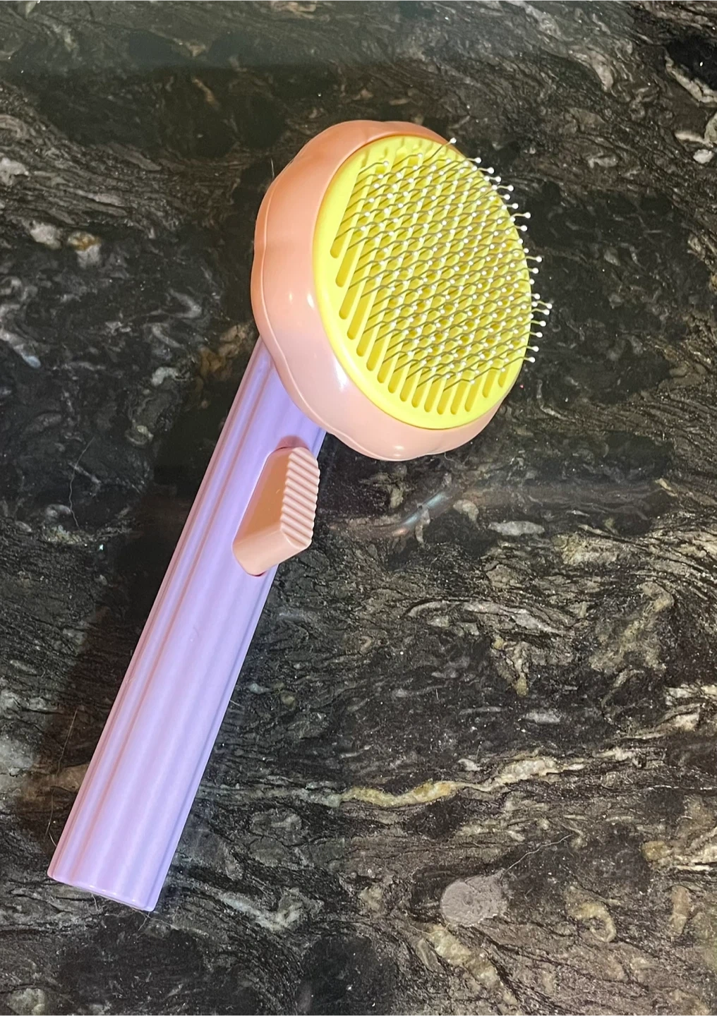 Groom your furry friend with this handy pet hair removal brush. It features a one-button self-cleaning mechanism to easily remove collected fur. The brush has fine bristles to effectively collect loose hair. Great for keeping your pet's coat tidy!