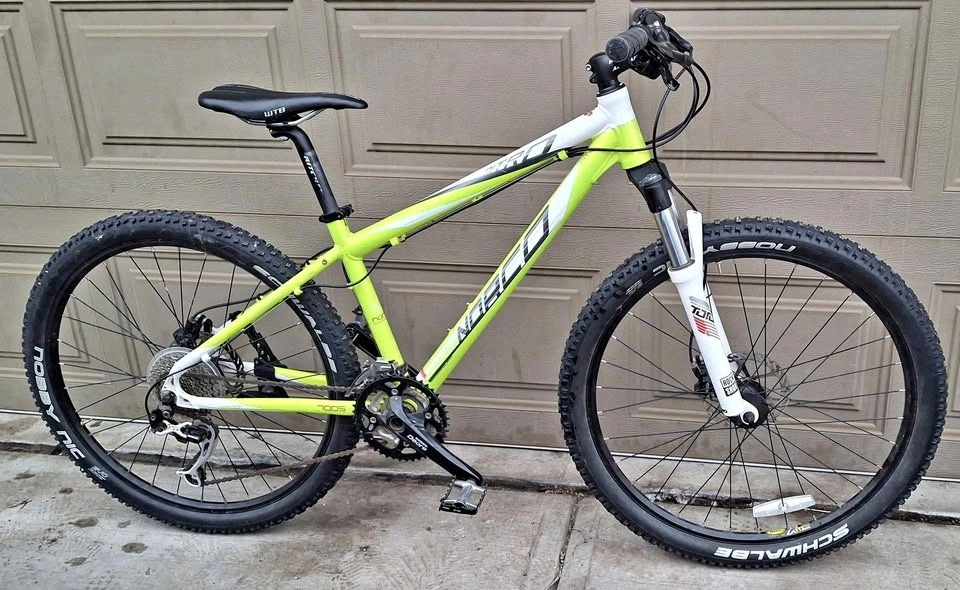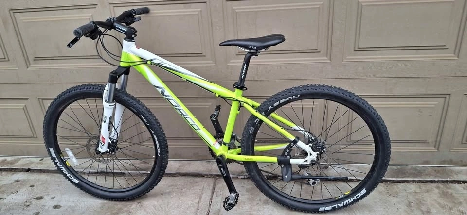 Selling a great condition Norco Nitro hardtail mountain bike, perfect for trail riding or daily commuting. The bike has a lightweight aluminum frame and a bright white and lime green color scheme.