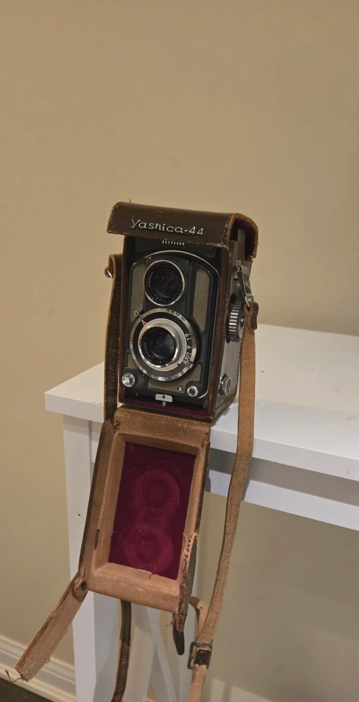 This is a Yashica-44 twin lens reflex camera. It comes with its original leather case and strap. It's a classic piece for any photography enthusiast!