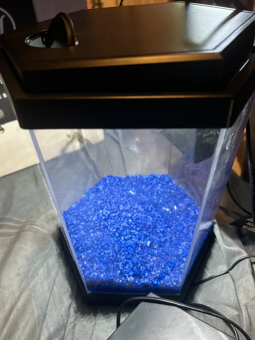 This is a small, hexagonal-shaped aquarium. It's filled with bright blue gravel. The tank comes with a black lid that has a feeding door and a filter