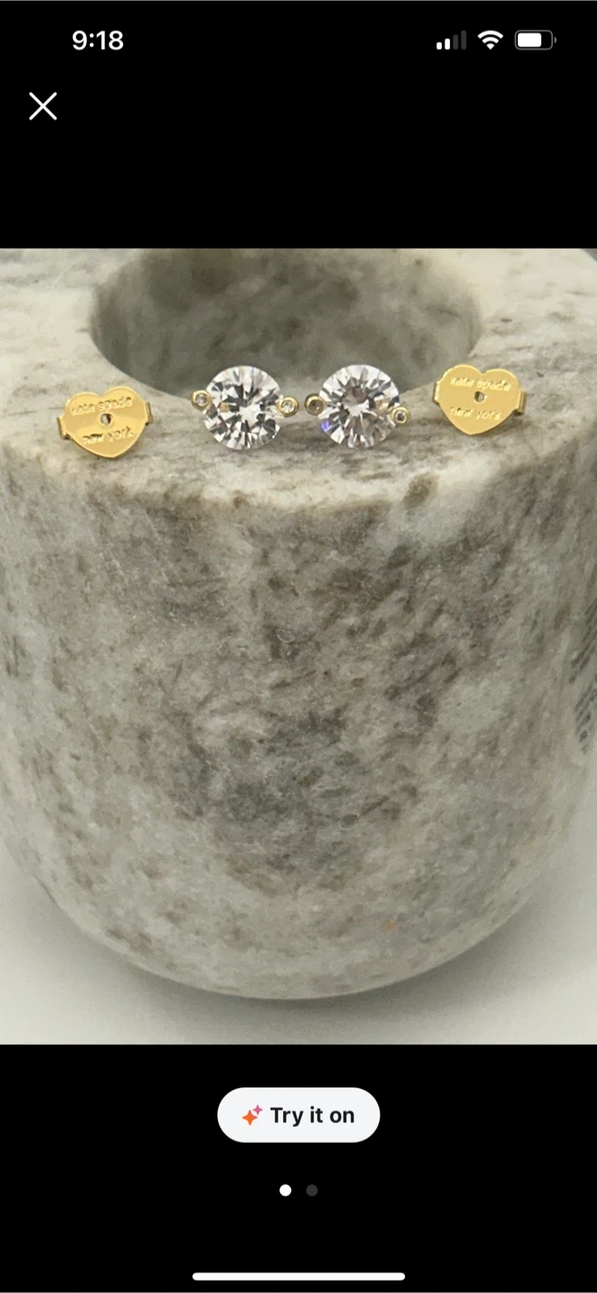Selling a pair of Kate Spade New York earrings. They are gold with princess cut diamond like stones. The backs of the earrings are heart shaped and engraved with the Kate Spade logo. They are new ordered extra pair .so selling the new ones