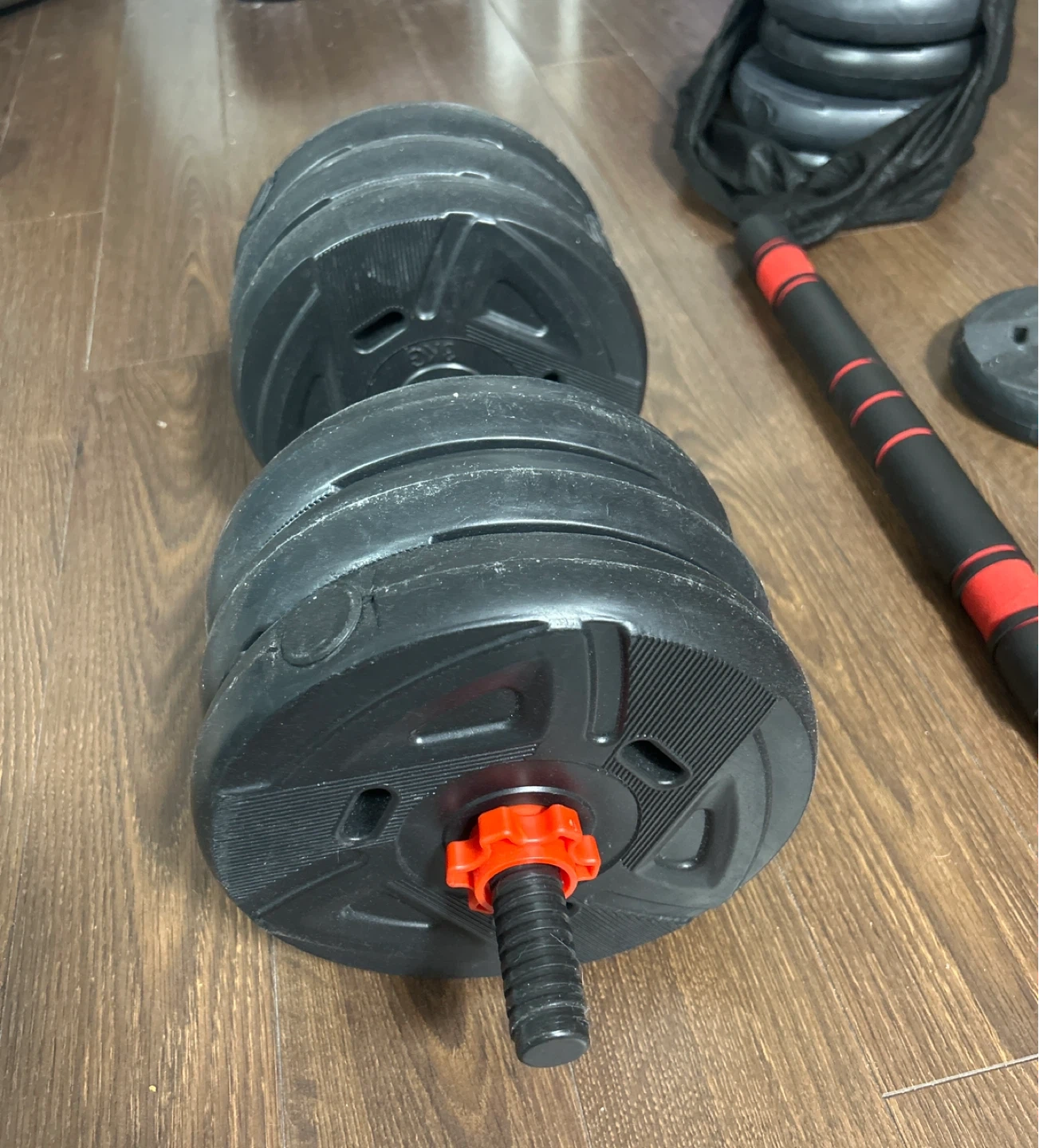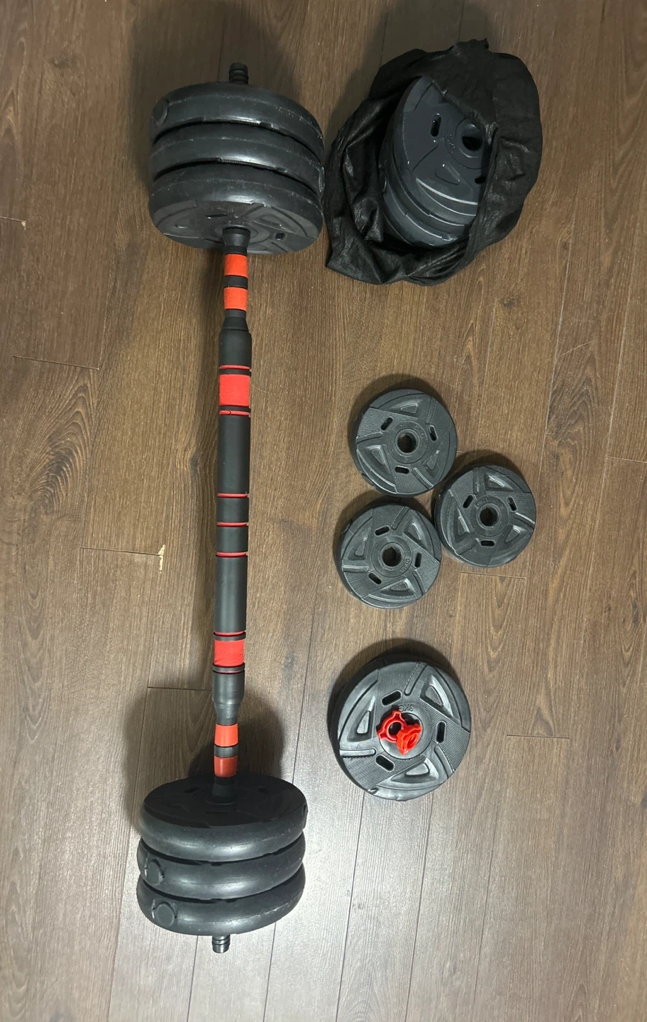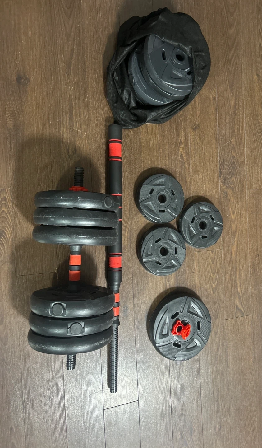 This is a set of adjustable dumbbells with extra weight plates. It includes a connecting bar to convert the dumbbells into a barbell. Perfect for home workouts!