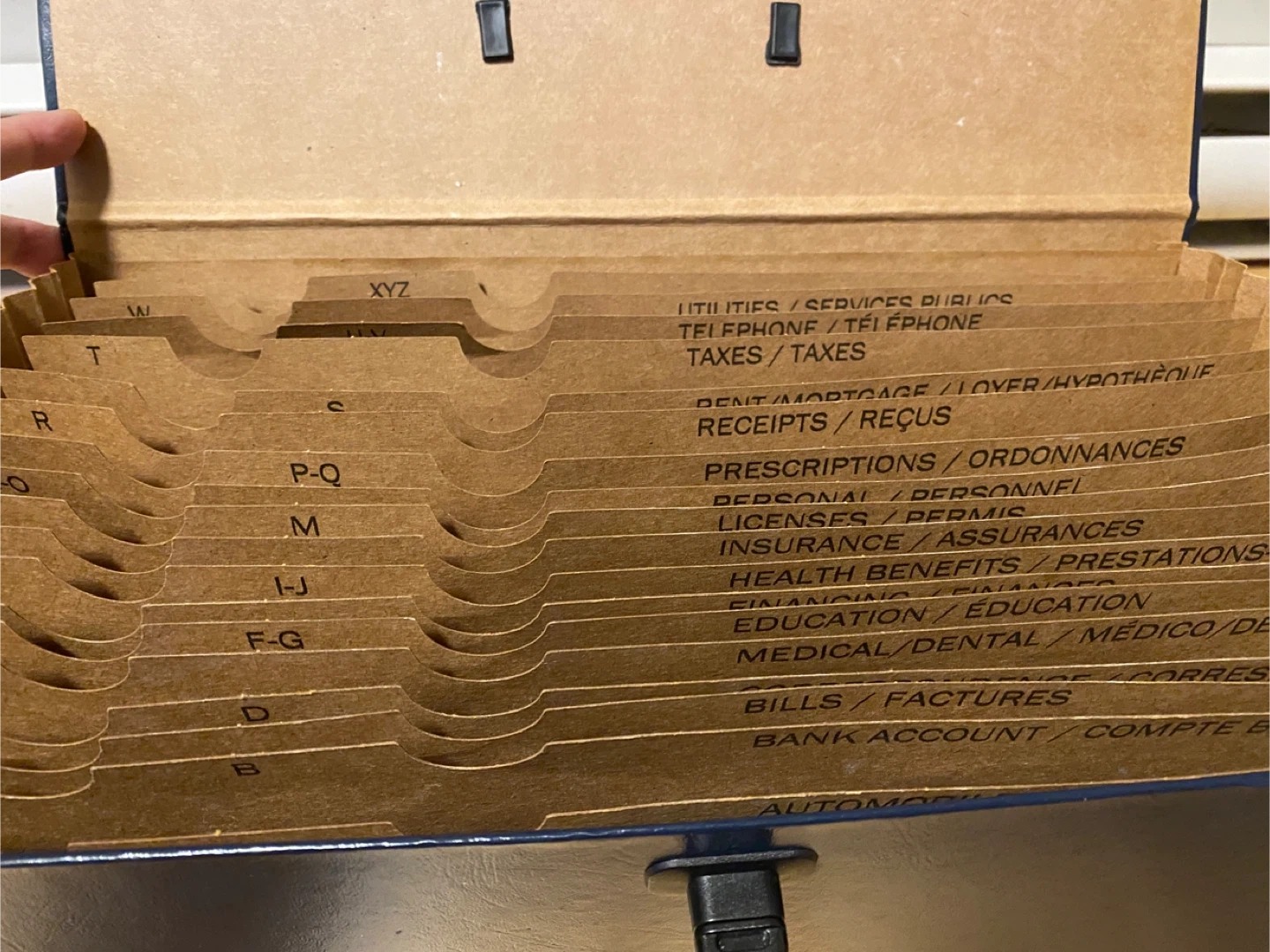 This is a dark blue accordion file organizer box. It features multiple labelled dividers for receipts, bills, and other important documents. It has a sturdy handle and a secure latch closure.