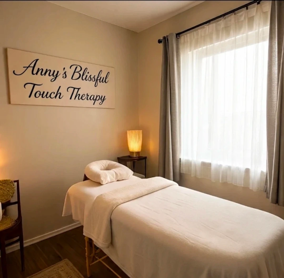 This is a massage bed from Anny's Blissful Touch Therapy. It comes with a headrest cushion and a soft, plush blanket. The bed is set up in a treatment room.