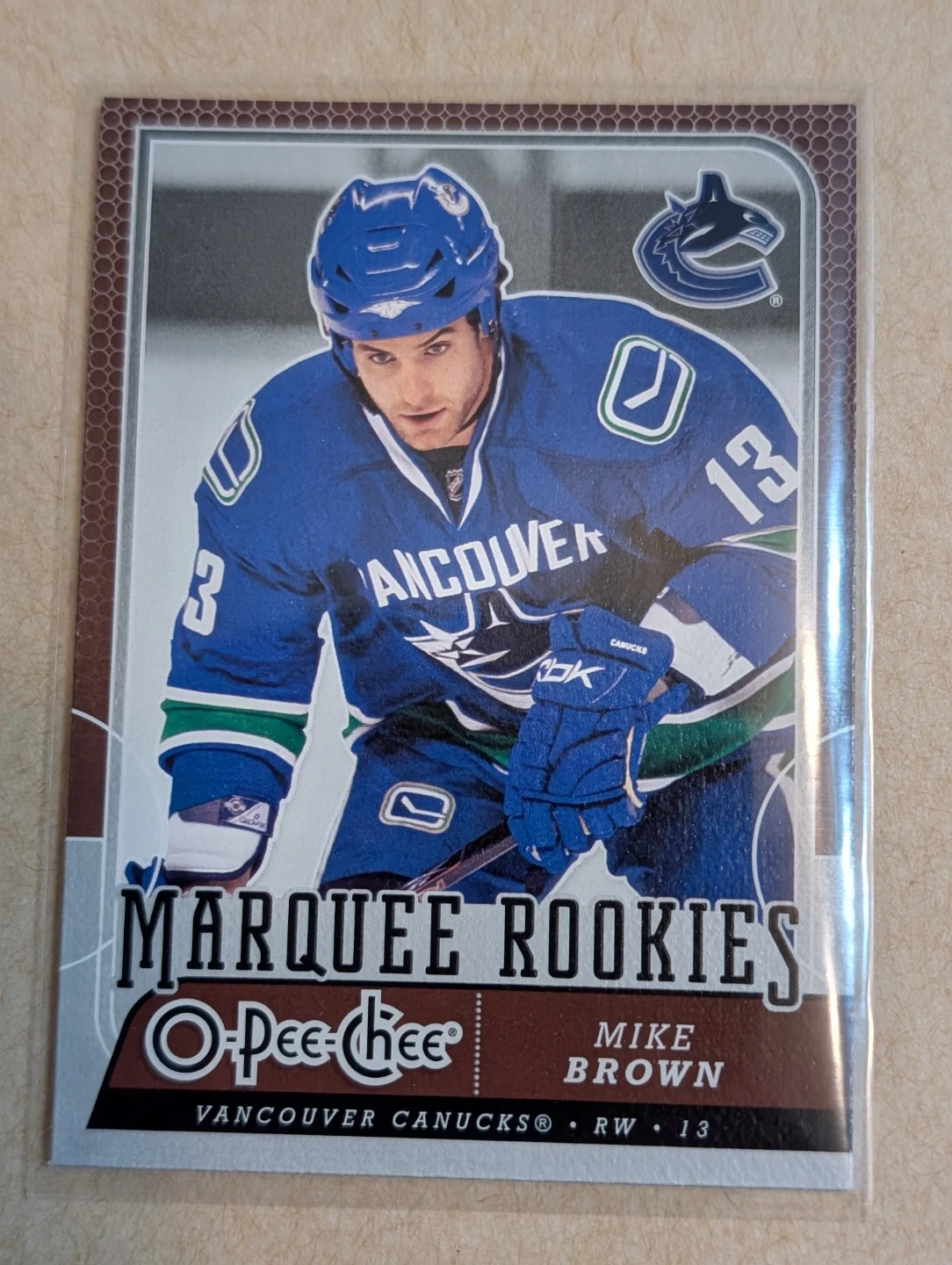 This is a 2008-09 O-Pee-Chee Marquee Rookies hockey card featuring Mike Brown of the Vancouver Canucks. It highlights his NHL career milestones. Collected his first NHL goal in his third career game at Minnesota.