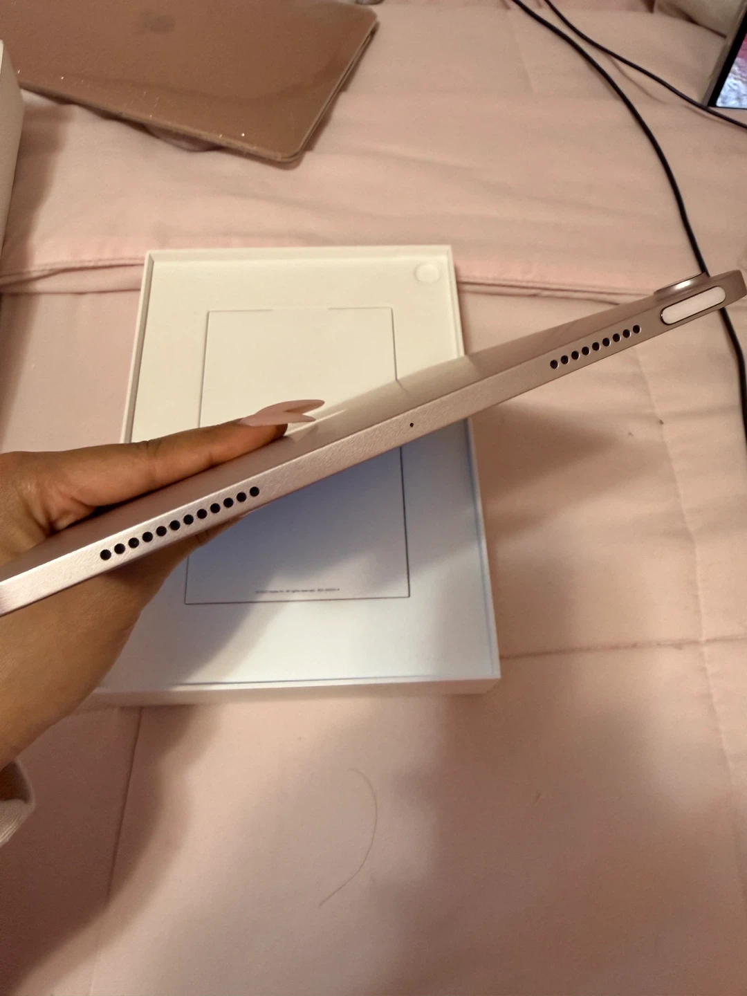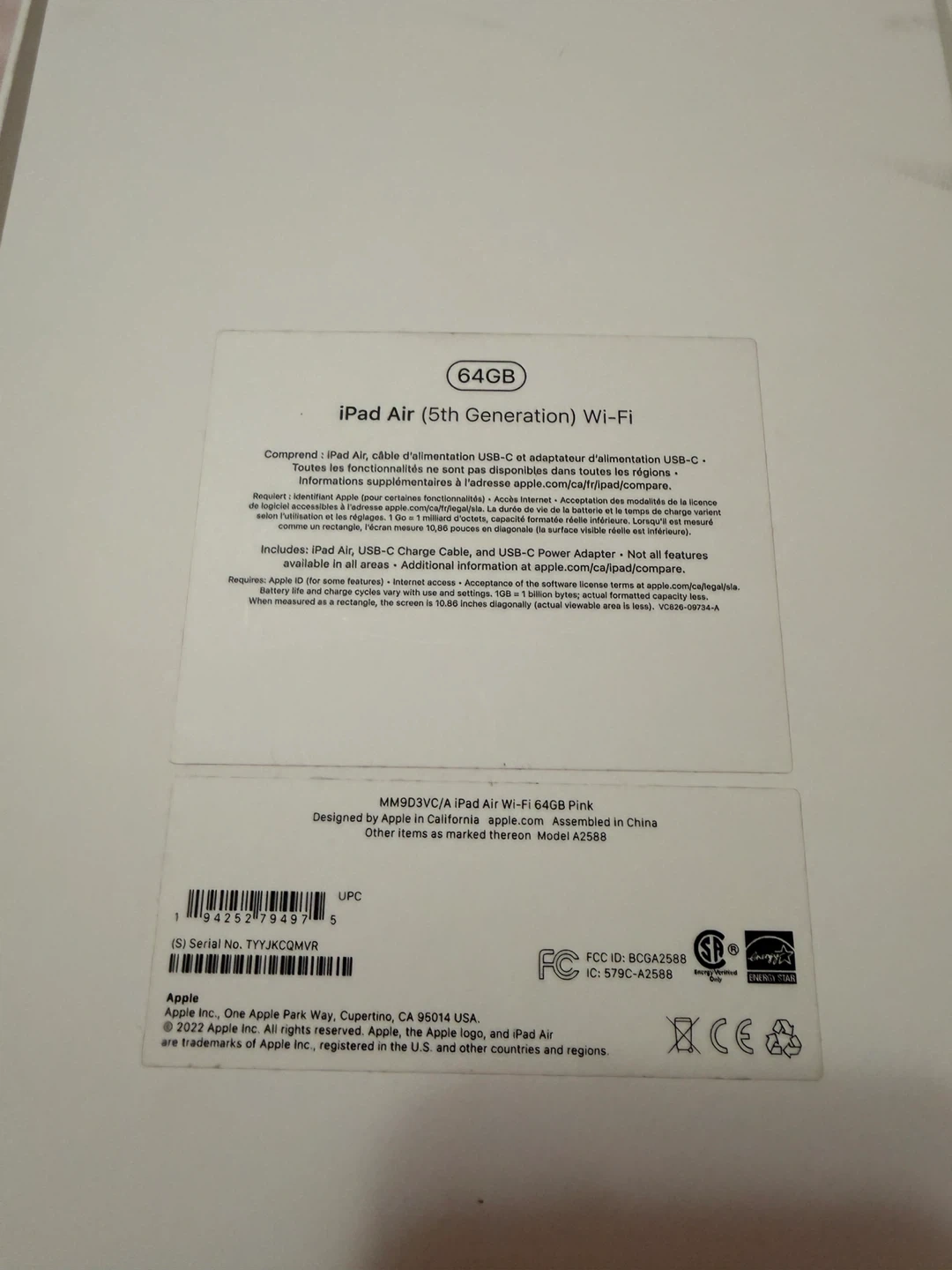 This is an Apple iPad Air (5th Generation) Wi-Fi model with 64GB of storage in pink. It includes the iPad, a USB-C Charge Cable, and a USB-C Power Adapter. It's in its original packaging.