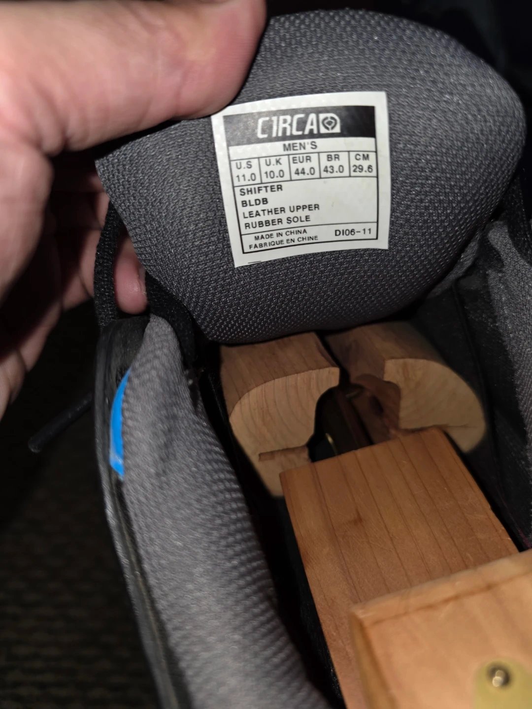 These Circa Shifter skate shoes are a men's size 11. They're black with blue accents. The shoes have a leather upper and a rubber sole. Good for skating!