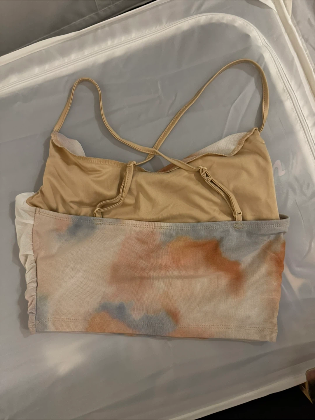 This stylish crop top features a trendy tie-dye pattern with a ruched mesh overlay. It has adjustable straps for a comfortable fit. The lightweight material makes it perfect for warm weather outings!
