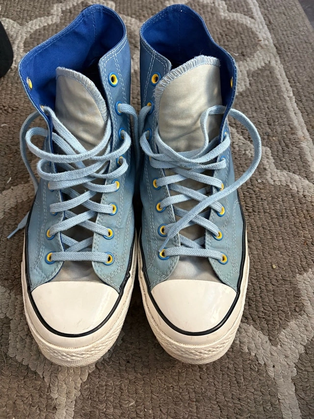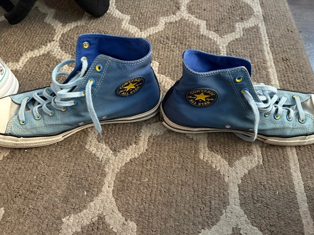 Step out in style with these used Converse Chuck 70 high-top sneakers, featuring a unique blue colourway. These stylish sneakers are in great condition and ready for a new home. Key features: - Brand: Converse - Model: Chuck 70 - Style: High-top - Colour: Blue - Condition: Gently Used - Size: US 10.5. These were limited edition and are hard to find. Payment: Cashless payment, Cash accepted.