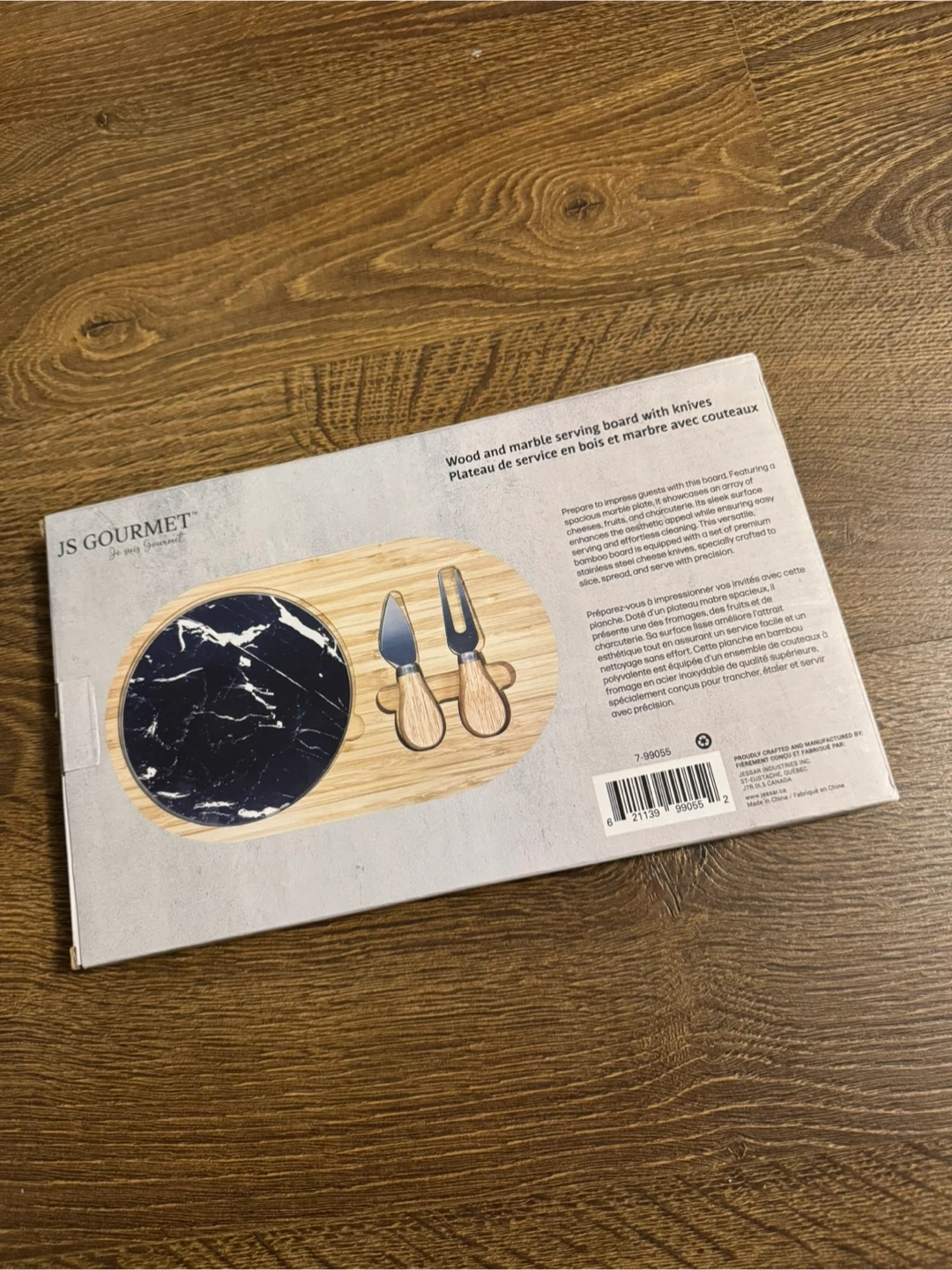 This wood and marble serving board comes with two cheese knives. It's perfect for serving cheese, crackers, meats, and fruits. The set includes a bamboo board with a marble inlay and stainless steel cheese knives. Brand new!
