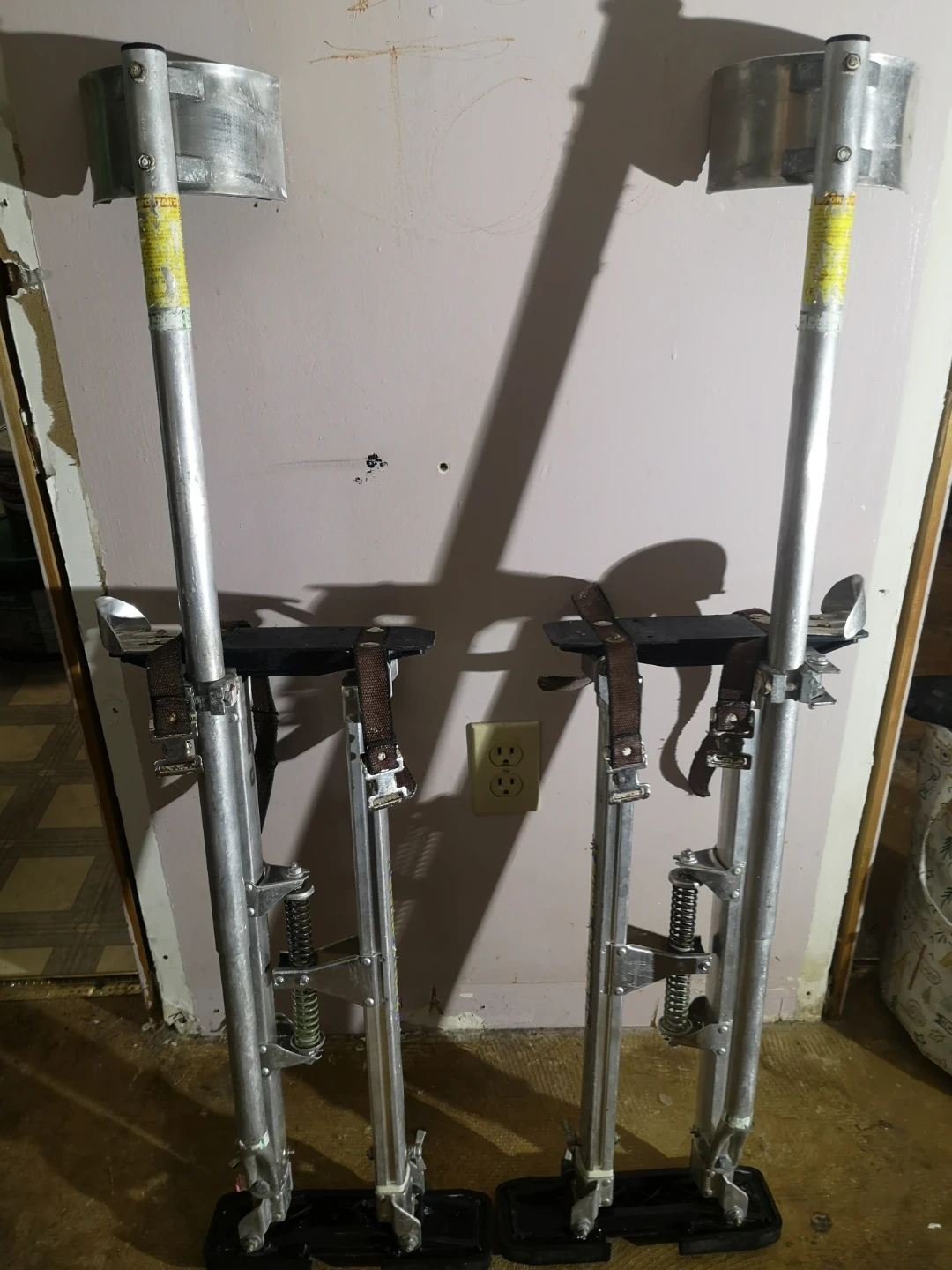 Pair of adjustable drywall stilts for painting or drywall work. Aluminum construction with rubber foot grips. Adjustable straps for secure fit. Great for reaching high ceilings!