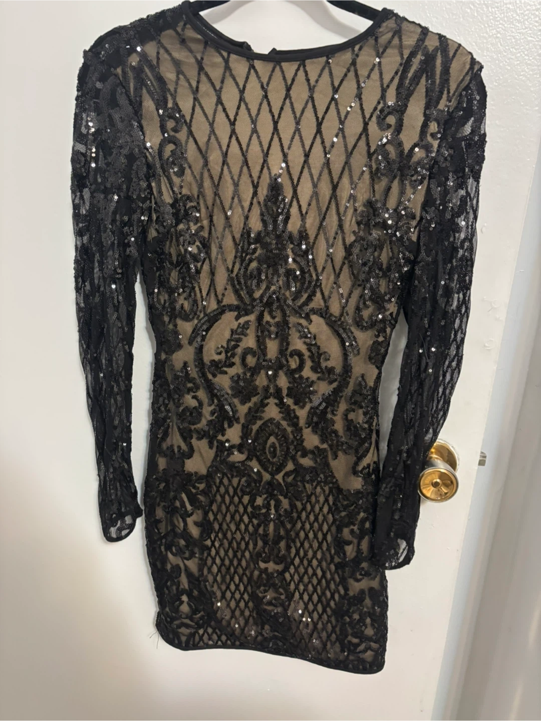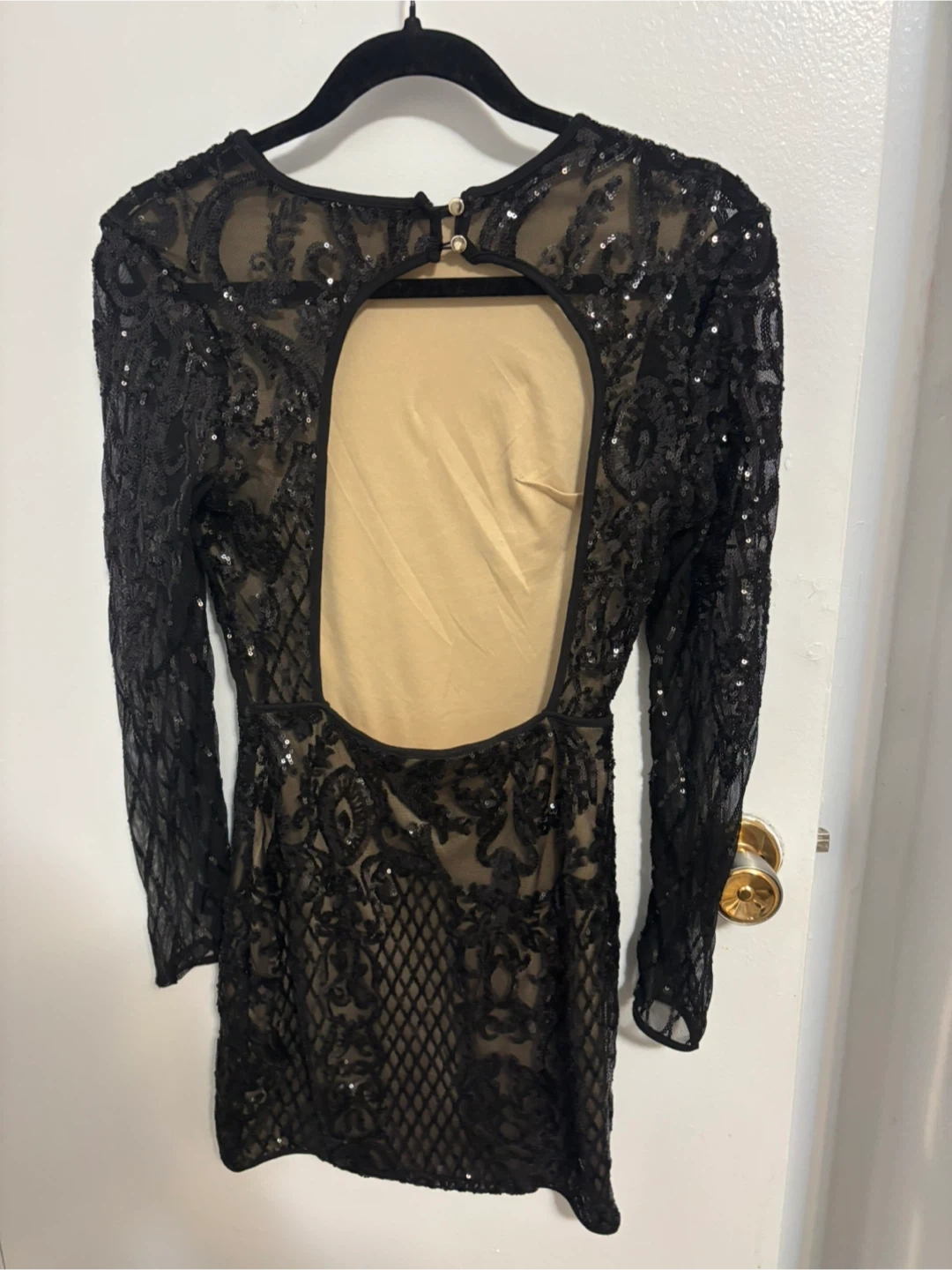 A sparkly black sequin mini dress featuring long sleeves and an open back cutout. It's designed with intricate lace detailing and a nude lining. This dress is perfect for a night out or a special occasion!