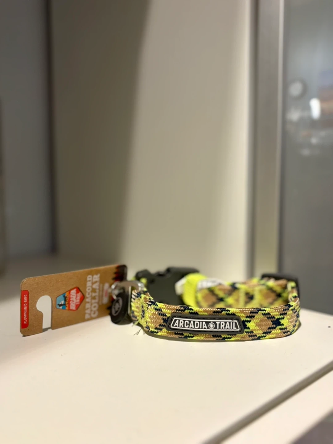 This is an Arcadia Trail paracord collar for dogs. It's a small size, measuring 10-14 inches (25.4-35.6 cm). It features an aluminum D-ring for leash attachment. Very solid collar.