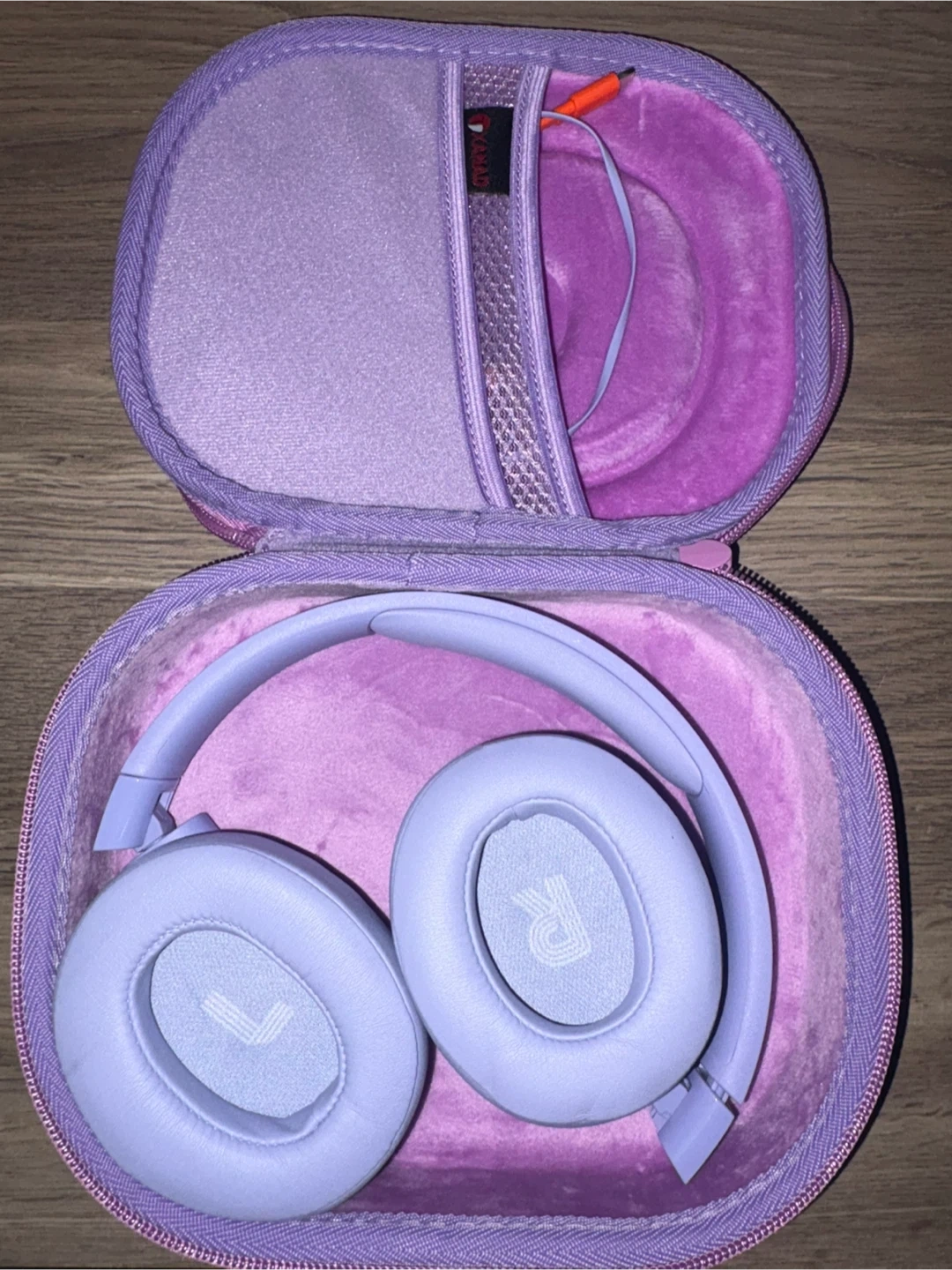 These are JBL Live 770NC wireless over-ear headphones in a nice purple colour. They include noise cancellation and Bluetooth 5.3. Comes with original charging cable and audio cable. Also includes a protective carrying case. Used less than 5 times, in great condition. Case was an additional purchase but included in pricing here.