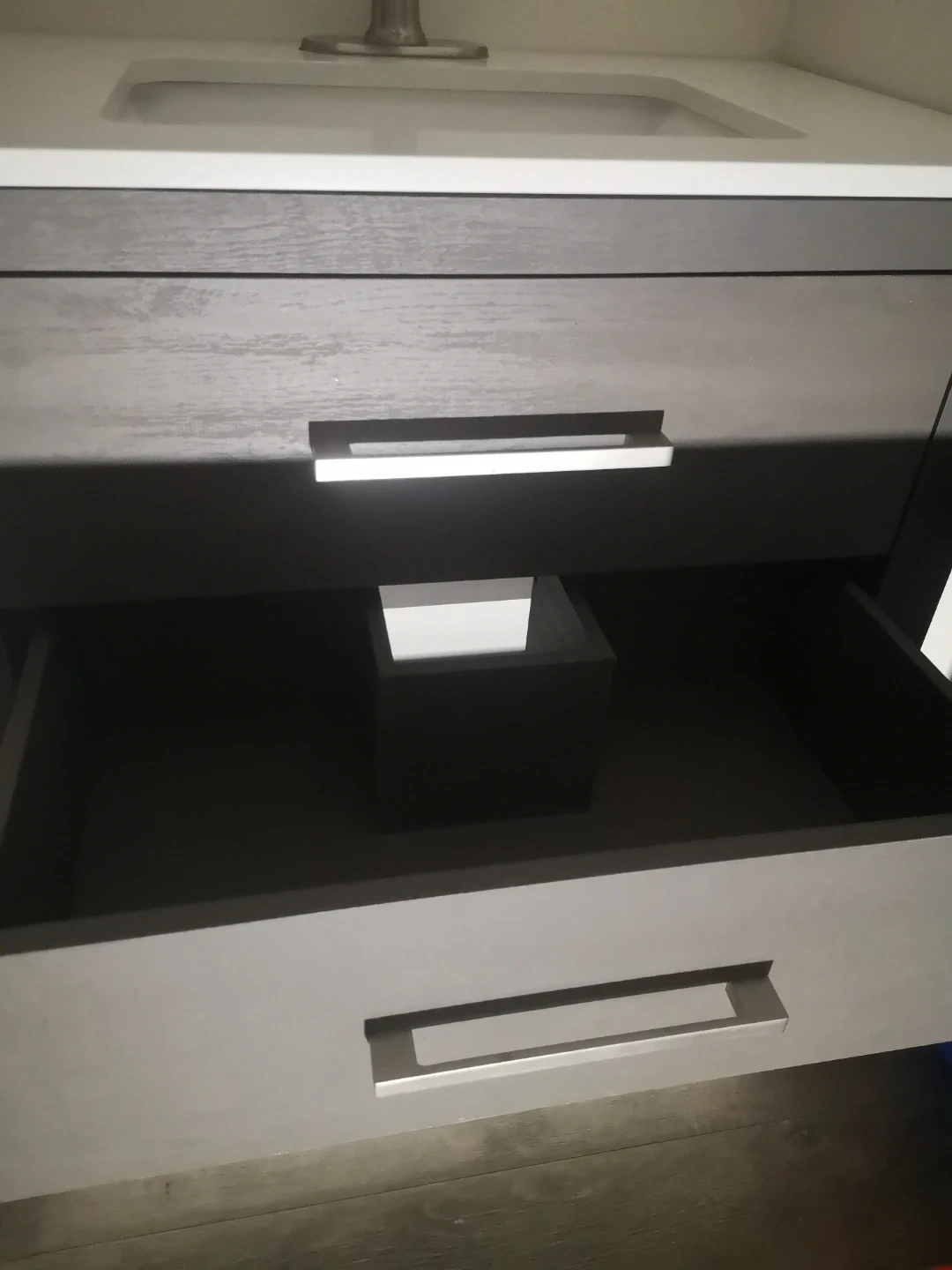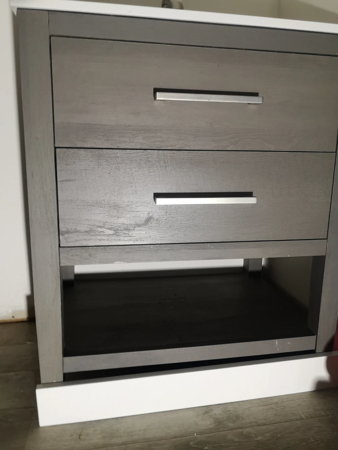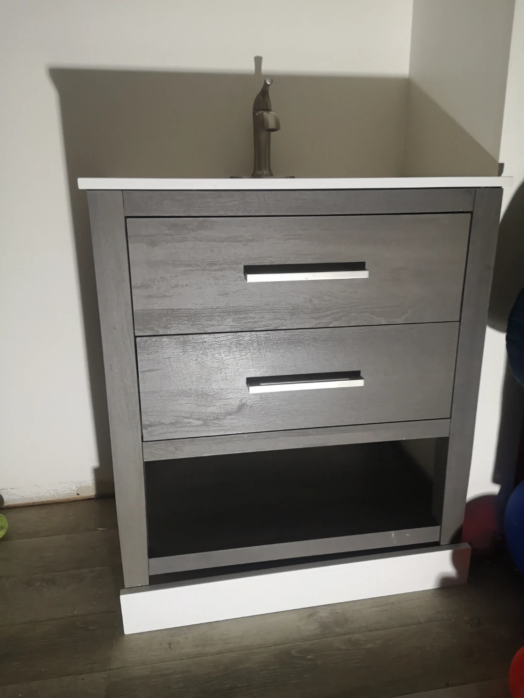 This is a modern bathroom vanity. It features two drawers and an open shelf for storage. The countertop is white and includes a stainless steel faucet. This unit would be great for a small bathroom or powder room. Brand new never used paid $350 asking $200 OBO!