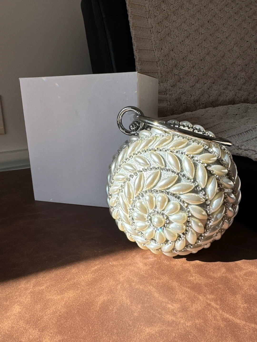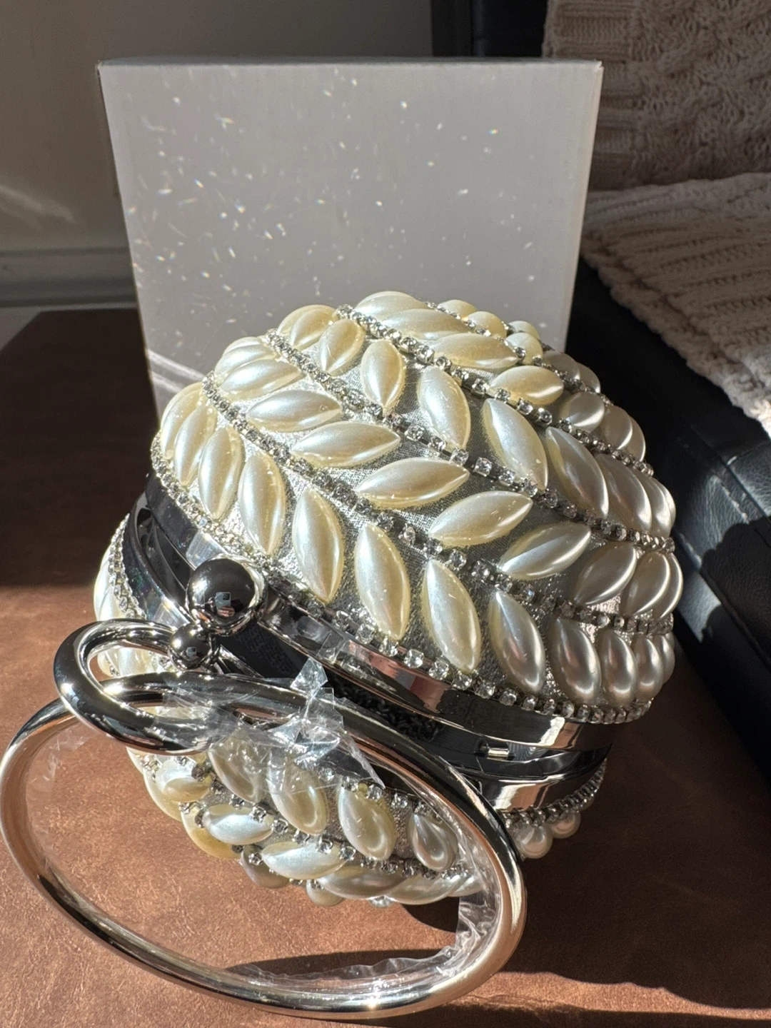 This eye-catching round clutch bag is adorned with faux pearls and sparkling rhinestones in a beautiful floral pattern. It features a silver-tone clasp and a delicate silver chain for easy carrying. Comes with its original box.
