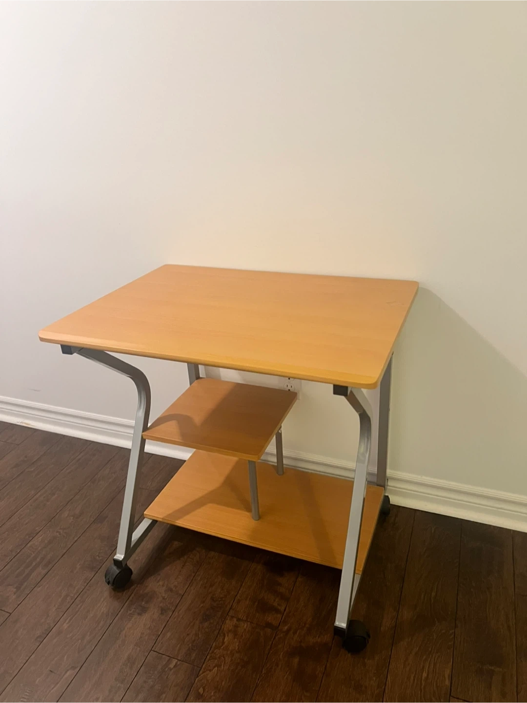 This rolling computer desk features a light wood finish top and two convenient shelves. It's built with a sturdy metal frame and casters for easy mobility. The compact design makes it a great addition to smaller workspaces.