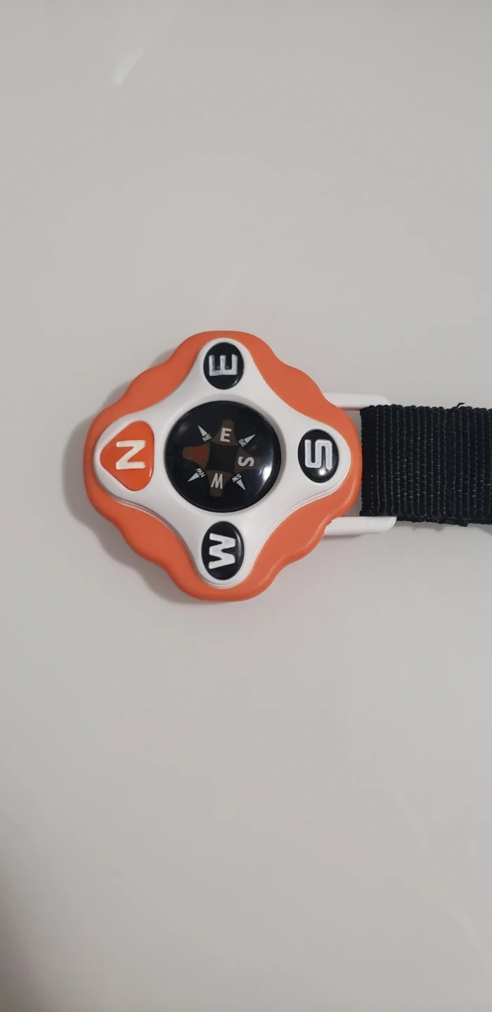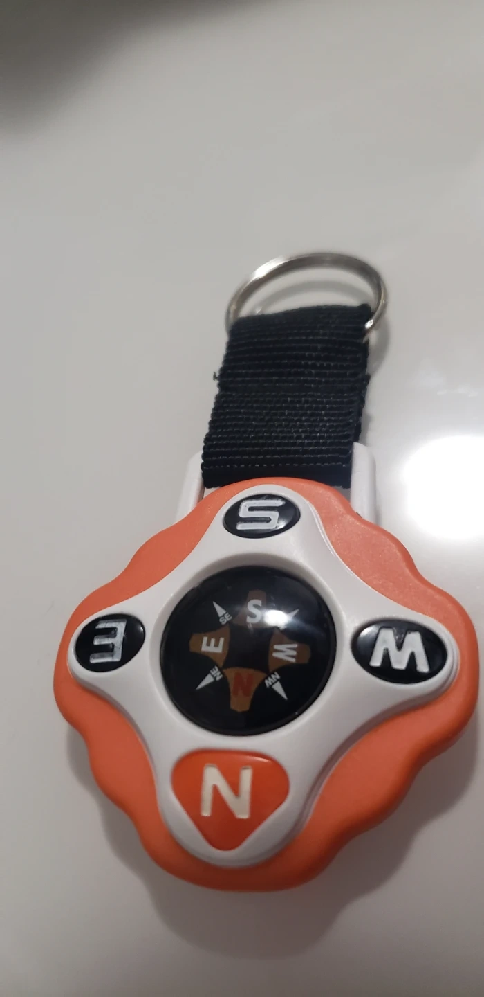 This is a compact compass keychain with a black nylon strap. It's designed for easy attachment to bags or keys. The compass points North, South, East, and West.