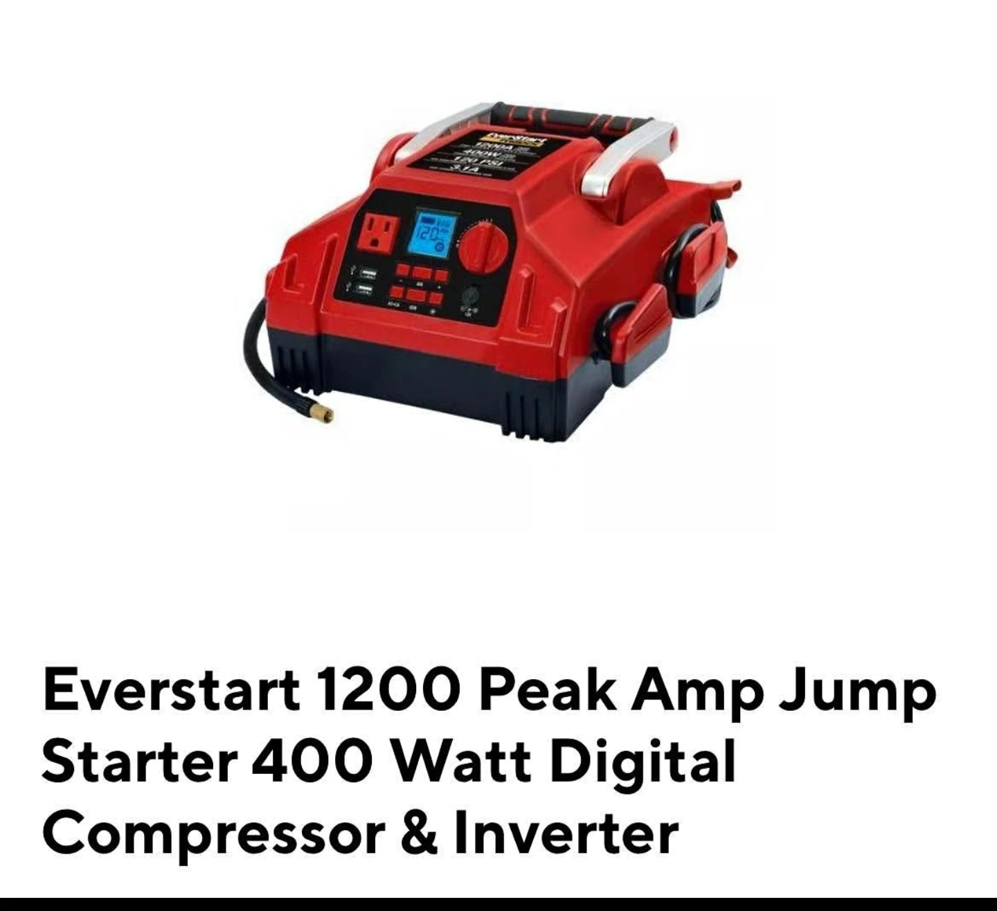 This EverStart Maxx jump starter offers 1200 peak amps for starting vehicles. It also features a 400W power inverter and a 120 PSI air compressor. Includes 3.1A USB power.