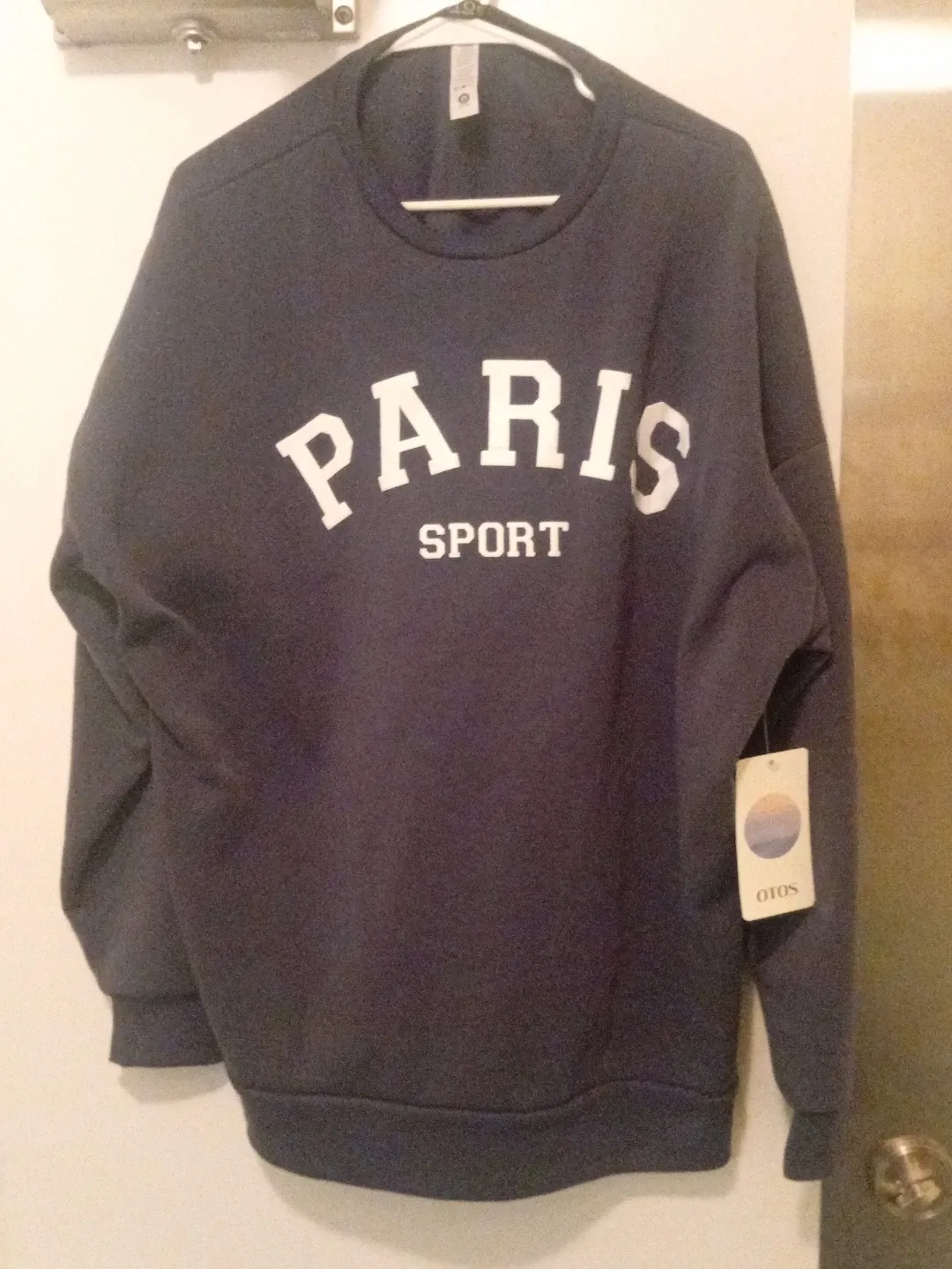 This is an OTOS New York Paris Sport sweatshirt in navy blue. It's a size 3X and made with 92% polyester and 8% spandex. Perfect for casual wear!