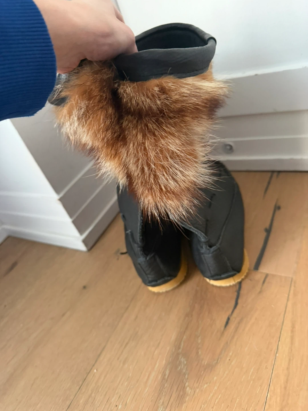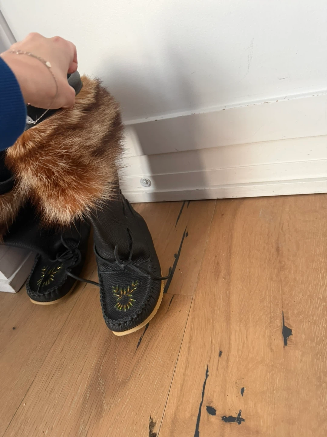 Black leather moccasin boots featuring a decorative stitched pattern on the toe and a real fur trim. They have a durable rubber sole. These boots are cozy and stylish for cooler weather. Gently used.
