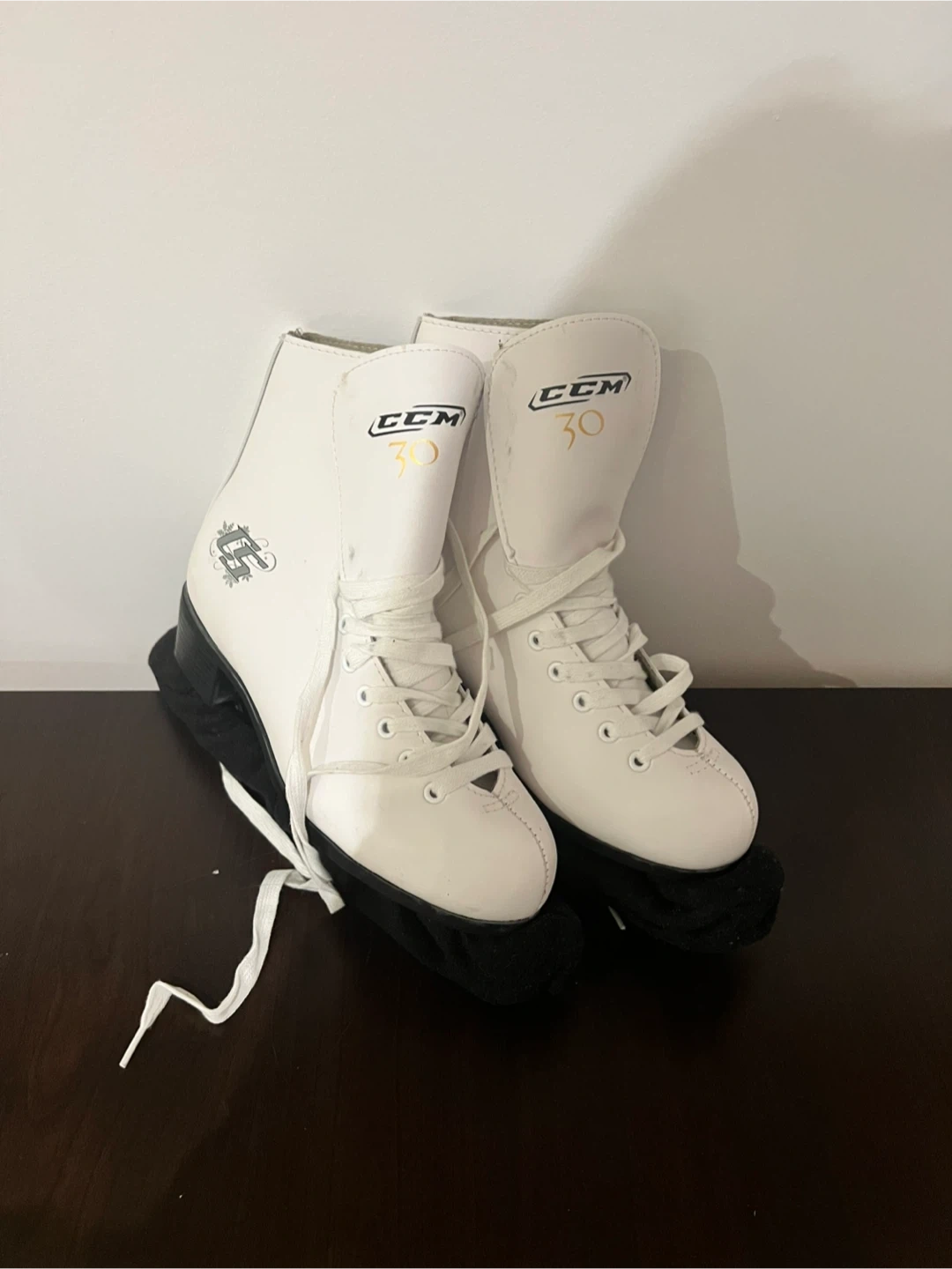 White CCM figure skates with black blade covers. Comes with laces. These skates are designed for figure skating.