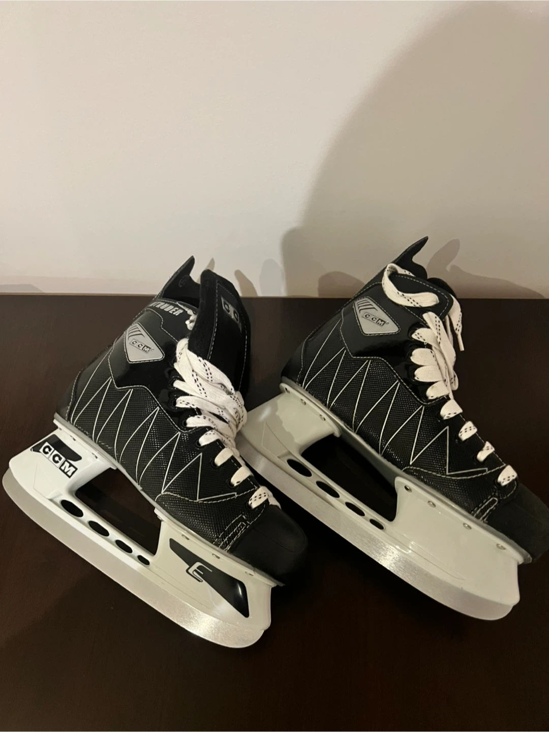 Pair of black and white CCM hockey skates. These skates are designed for performance on the ice. They're ready for your next game or practice session!