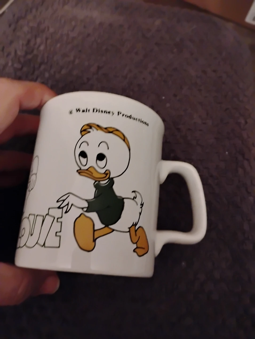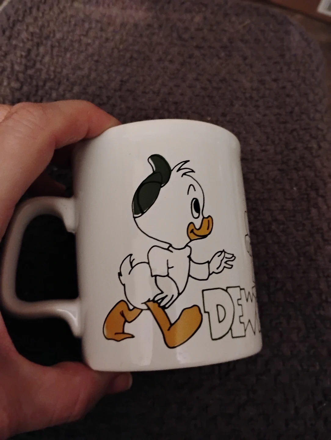 VINTAGE!! DISNEY'S HUEY, DEWEY & LOUIE MCDUCK MUG. HAS BEEN USED, THERE ARE A FEW STIR MARKS ON THE BOTTOM FROM A METAL SPOON. NO STAINS, CRACKS OR CHIPS.