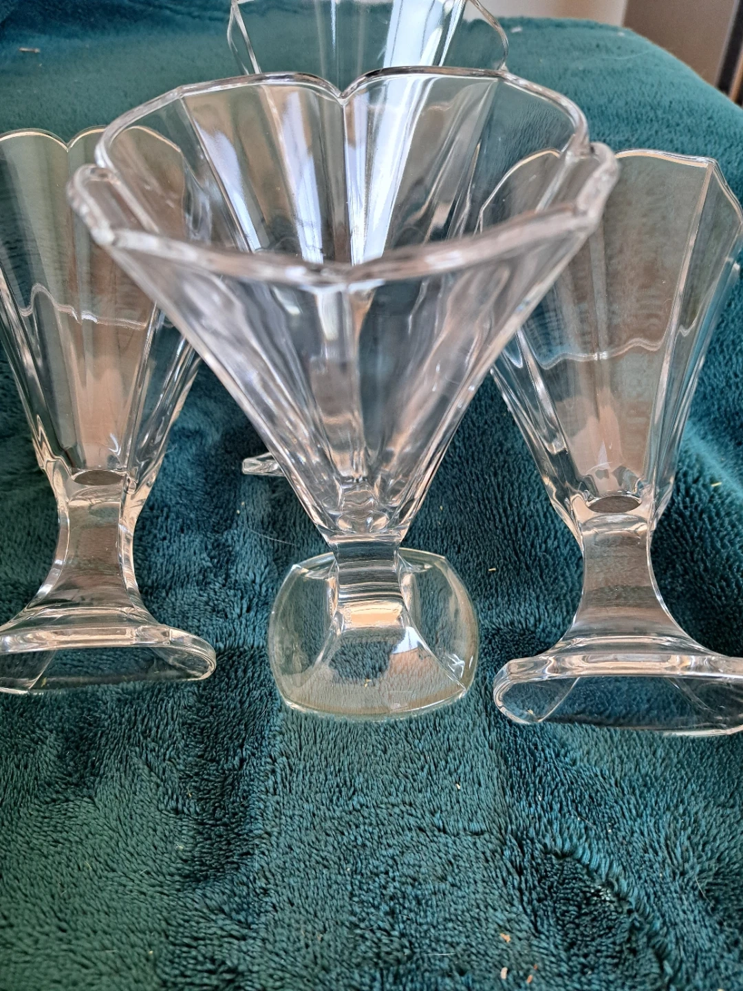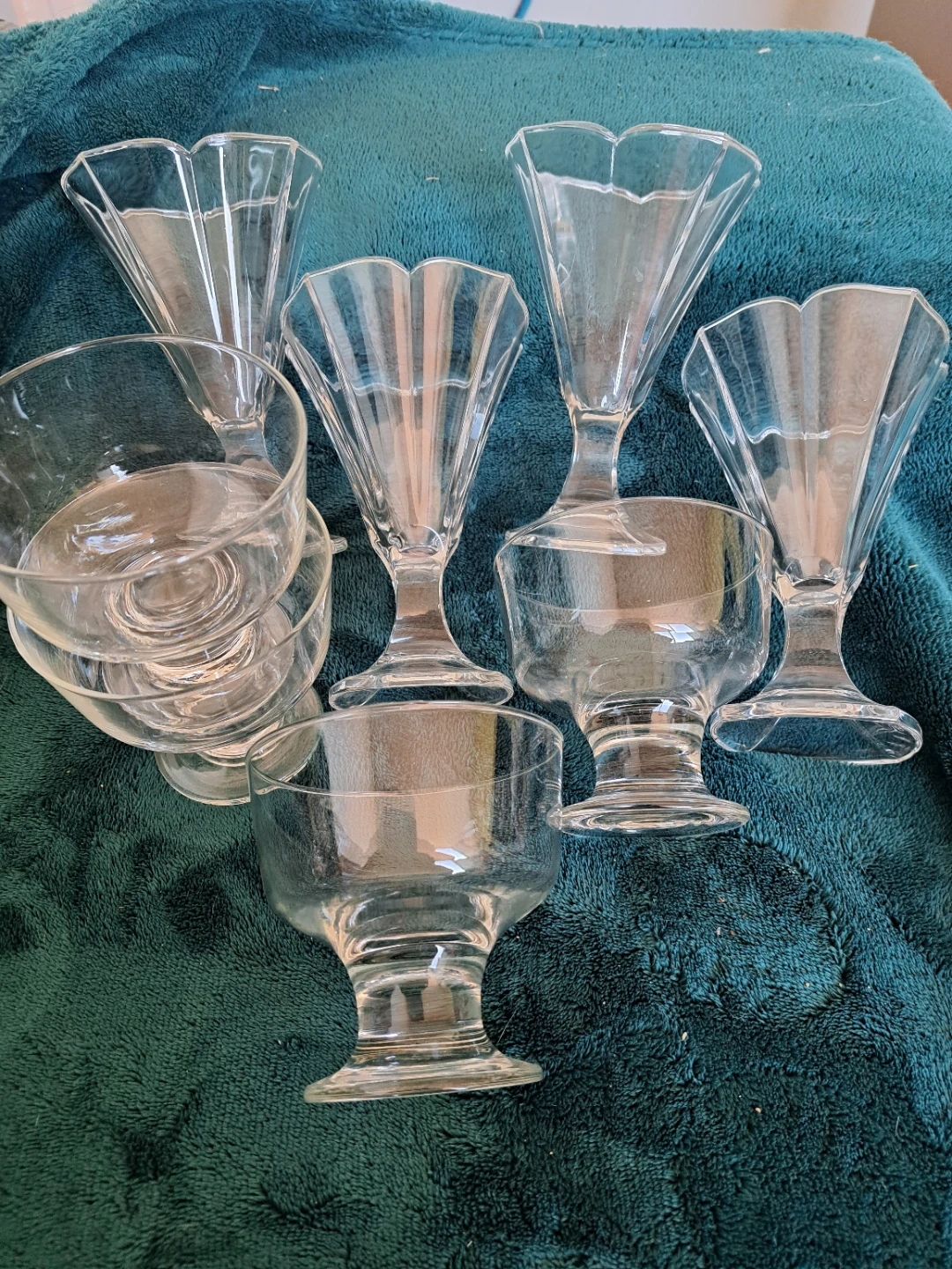 This is a set of eight clear glass dessert cups. The cups are made of glass and come in two different styles, some with fluted edges. They're perfect for serving ice cream or other sweet treats!