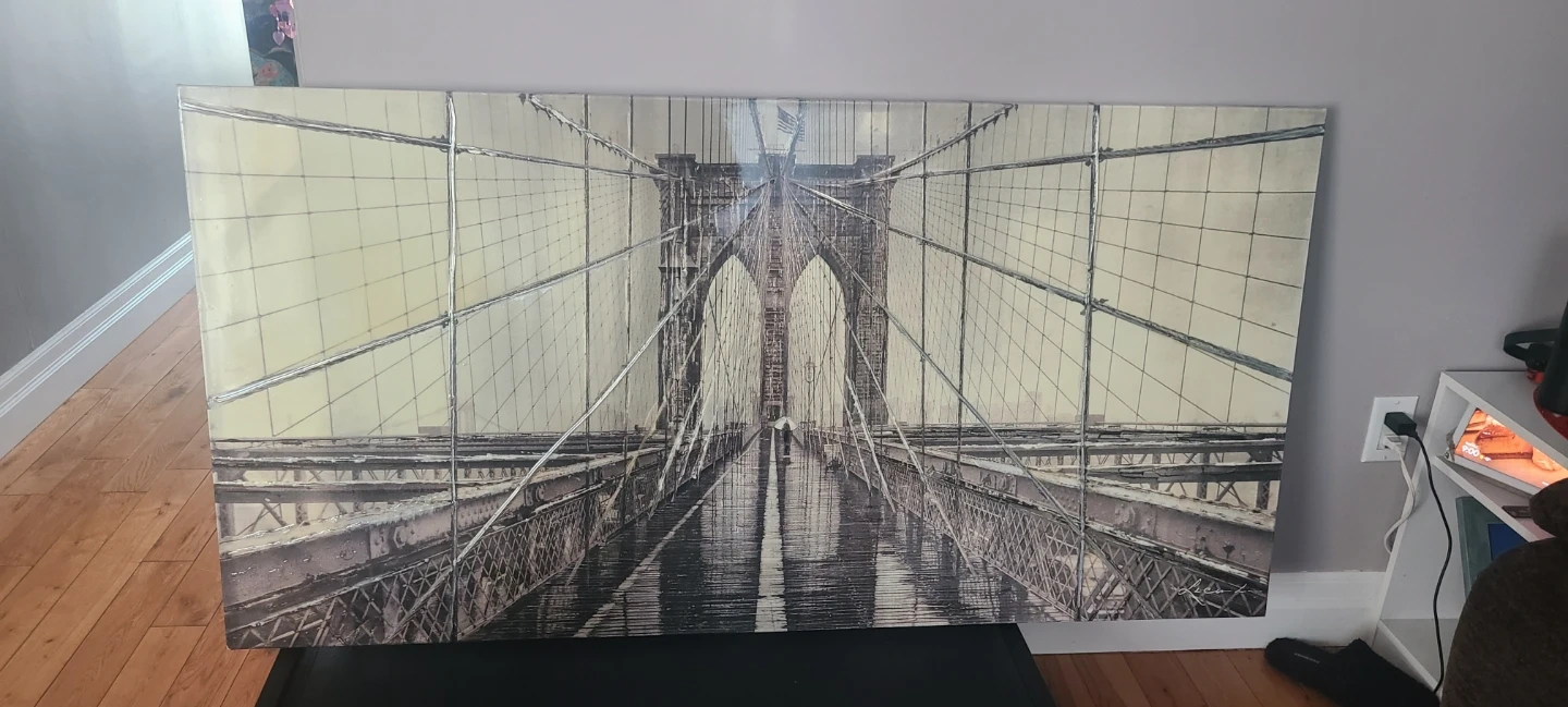 Large canvas print featuring the iconic Brooklyn Bridge. It's a piece that will add a dramatic focal point to any room. The artwork depicts a moody, rainy day scene on the bridge, with a lone figure holding an umbrella.