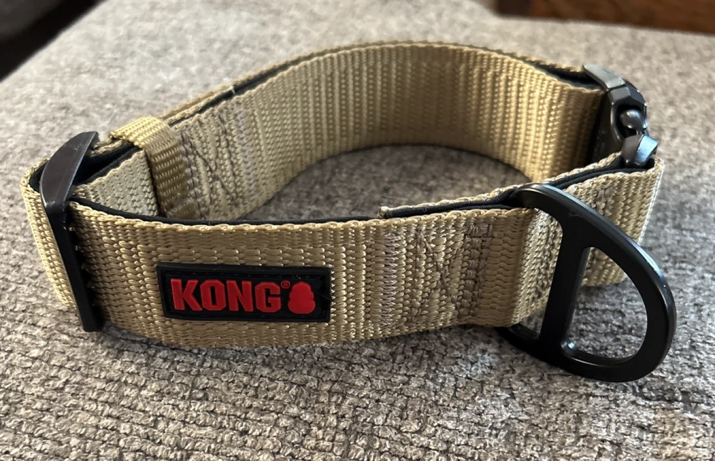 This is a KONG brand dog collar. It's tan with a black buckle and leash attachment. Neck size fits 14-20 inches. Fits dogs weighing 36-55 lbs.