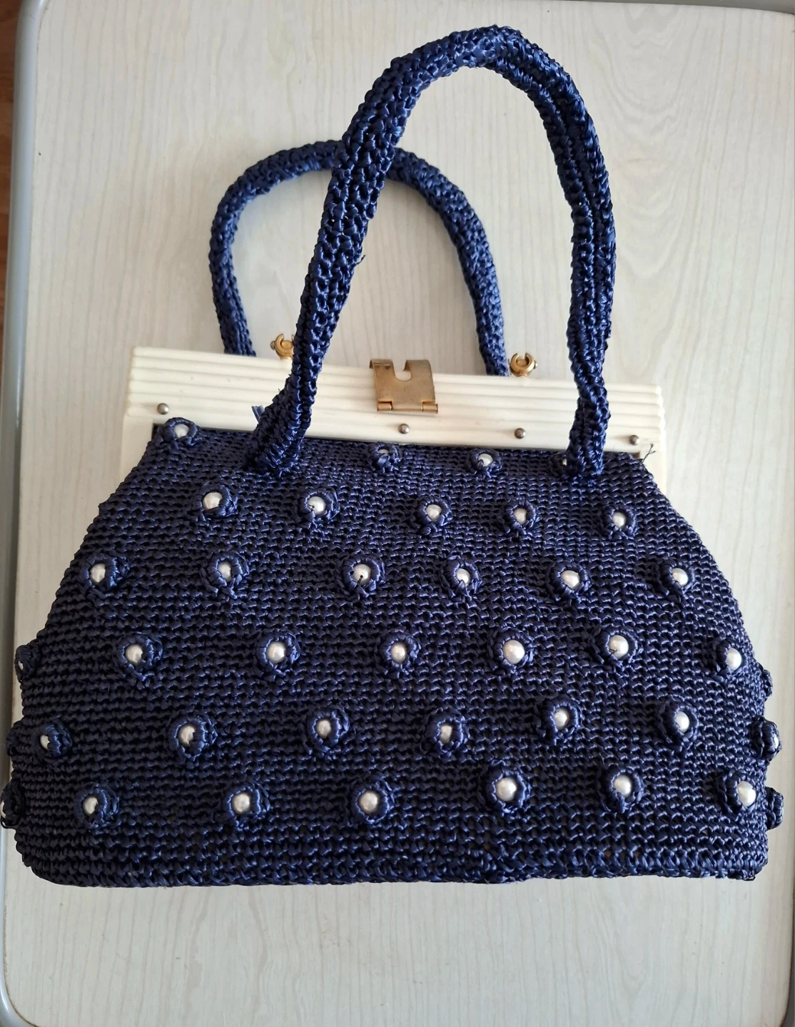 This vintage-inspired navy blue handbag is crafted from a woven material and adorned with delicate pearl-like embellishments. It features a secure clasp closure and sturdy braided handles. It's a stylish choice for adding a touch of elegance to any outfit.
