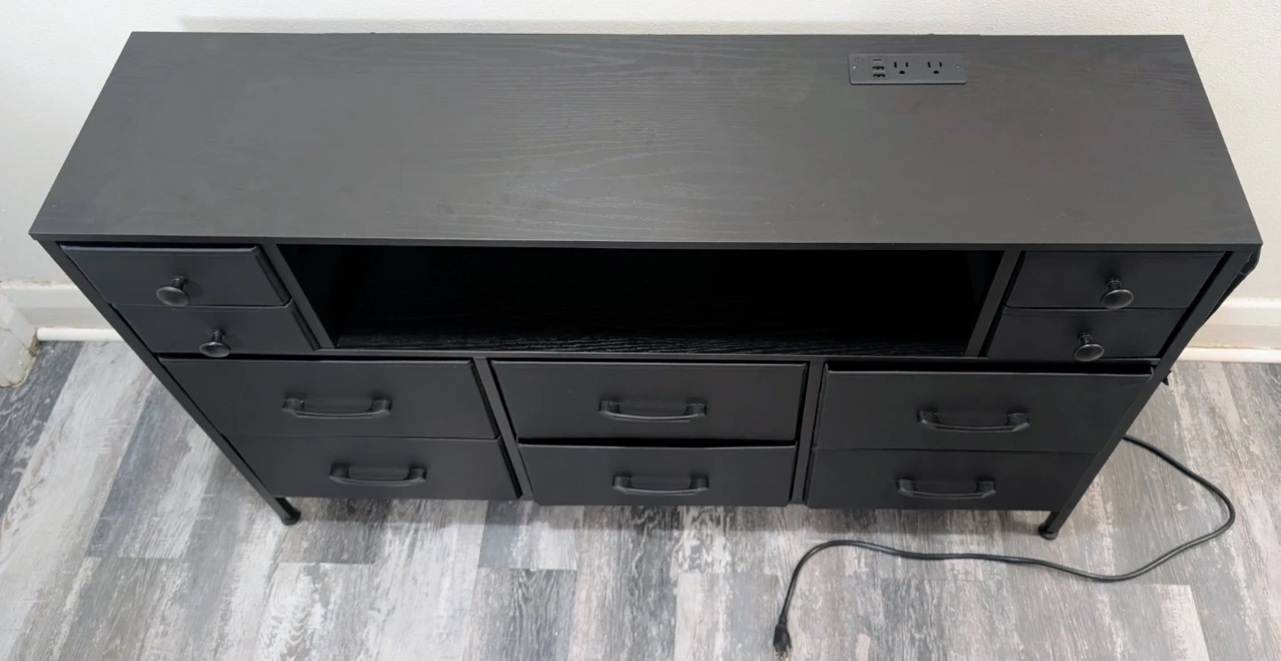 This fabric dresser features a sleek black finish with multiple drawers for storage. It's equipped with a built-in power strip on top for convenient charging. Three USB ports and one USB c. Comes with a central open shelf for media consoles or decor.