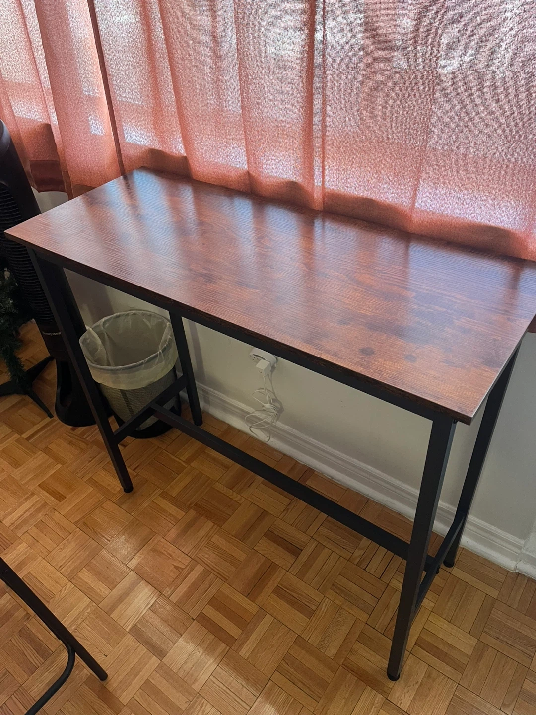 This console table has a rustic wood-look top with a black metal frame. It's a great size for a narrow space. Use it for a workspace or display table!