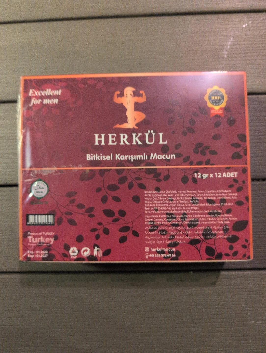 HERKÜL Bitkisel Karışımlı Macun comes in a 12-pack. It's an herbal blend for men. Ingredients include Carob tree molasses, Honey, Carob tree powder, Roost of fenugreek, Wild turmeric, Coriander, F Fennel, Black Cumin, Cinnamon, and others.