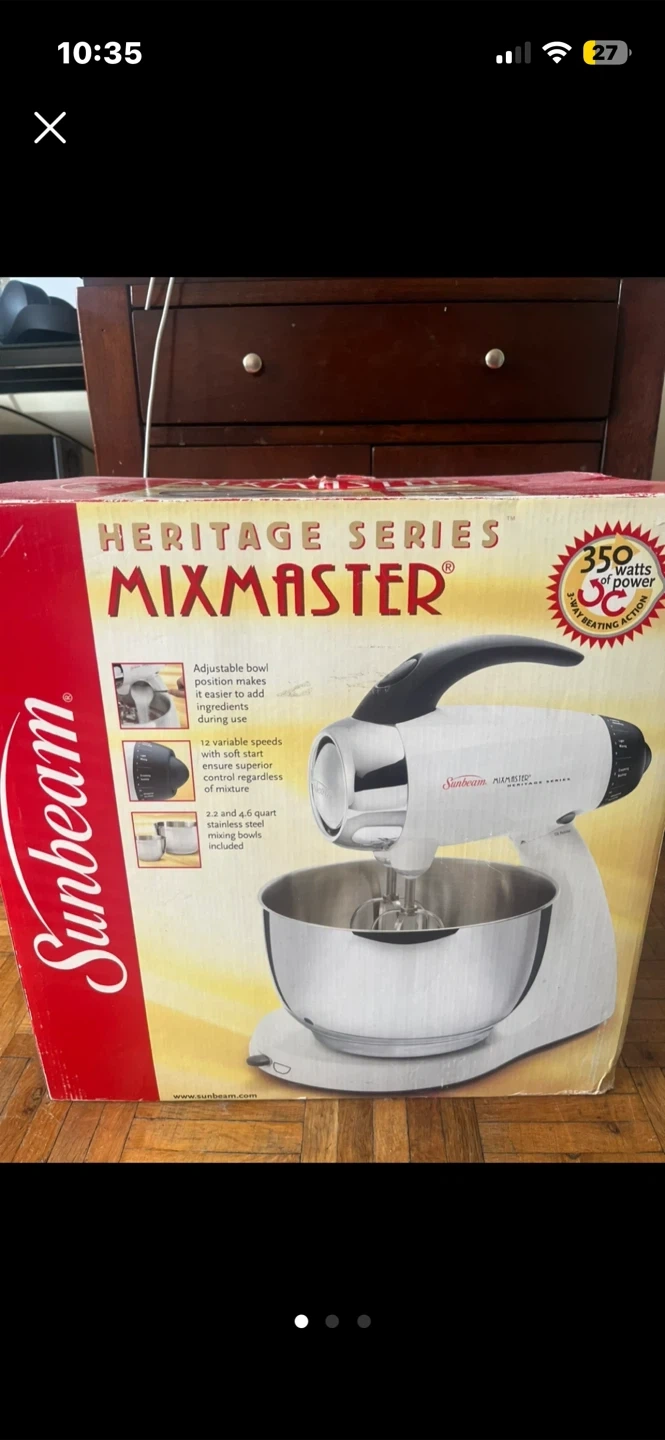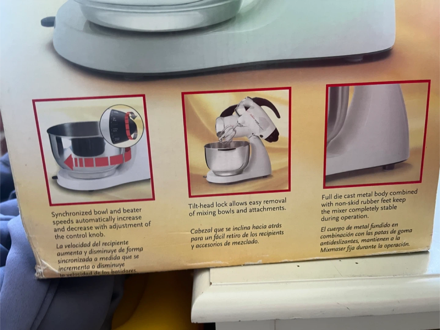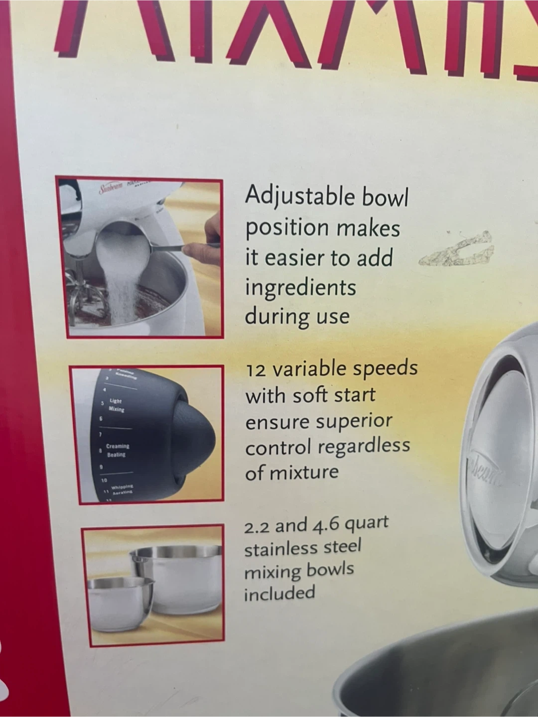 This Sunbeam Mixmaster features an adjustable bowl and 12 variable speeds with soft start. It comes with 2.2 and 4.6 quart stainless steel mixing bowls. The tilt-head design and non-skid rubber feet ensure stability during operation. It's great for creaming, beating, and kneading.