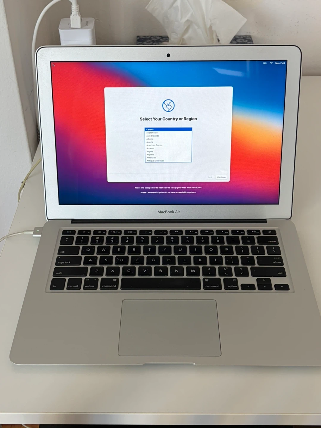 This is a silver Apple MacBook Air laptop. It comes with a charger. It's ready for a new owner to set it up!