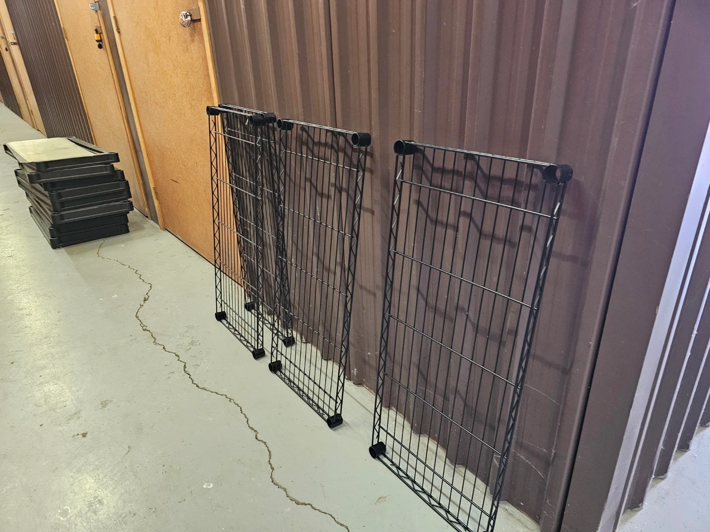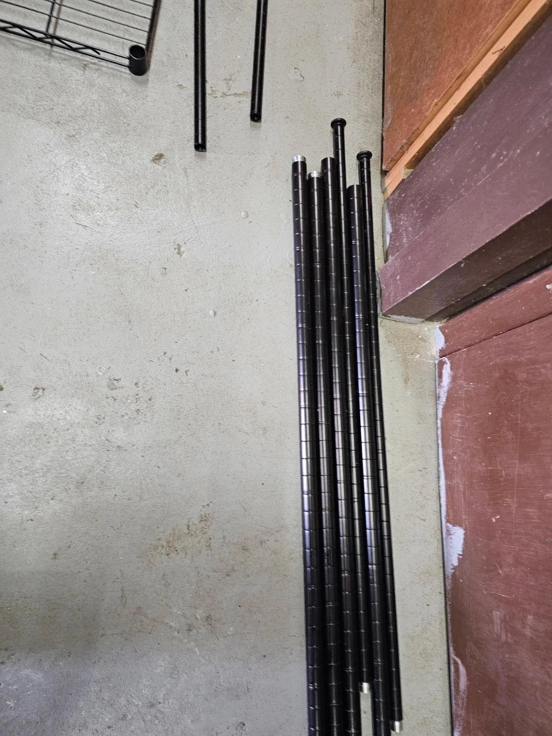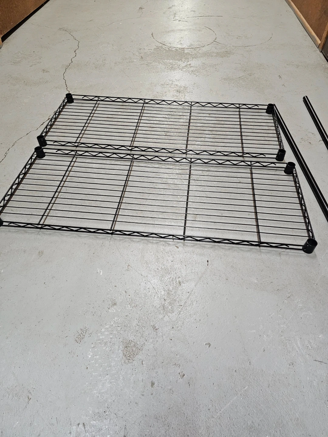 This is a black metal wire shelving unit, perfect for organizing your garage or storage space. It's made of durable metal wire and includes multiple shelves and support poles for assembly.