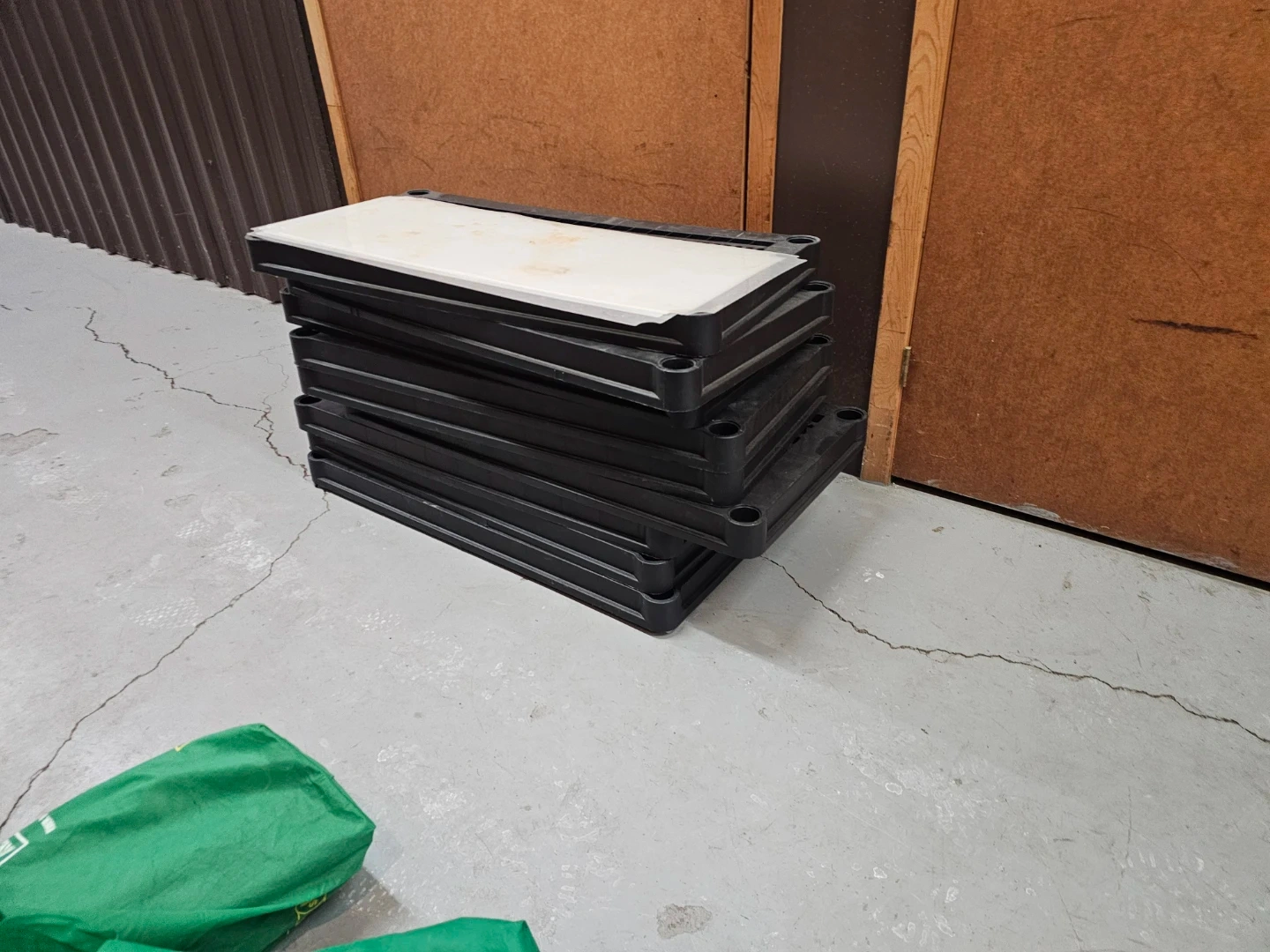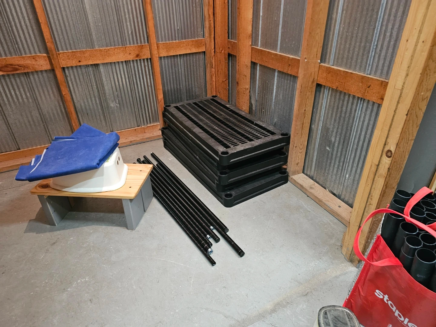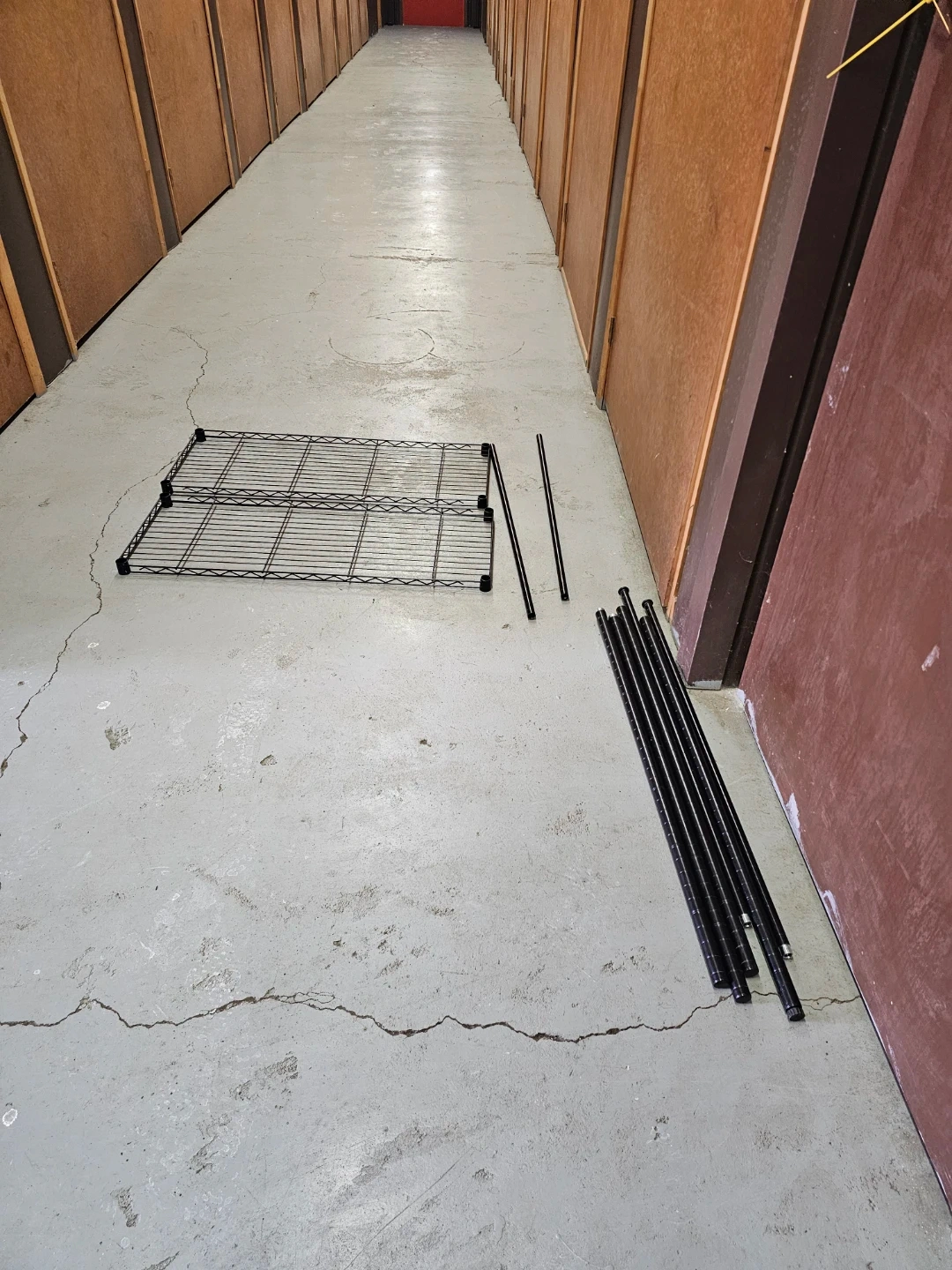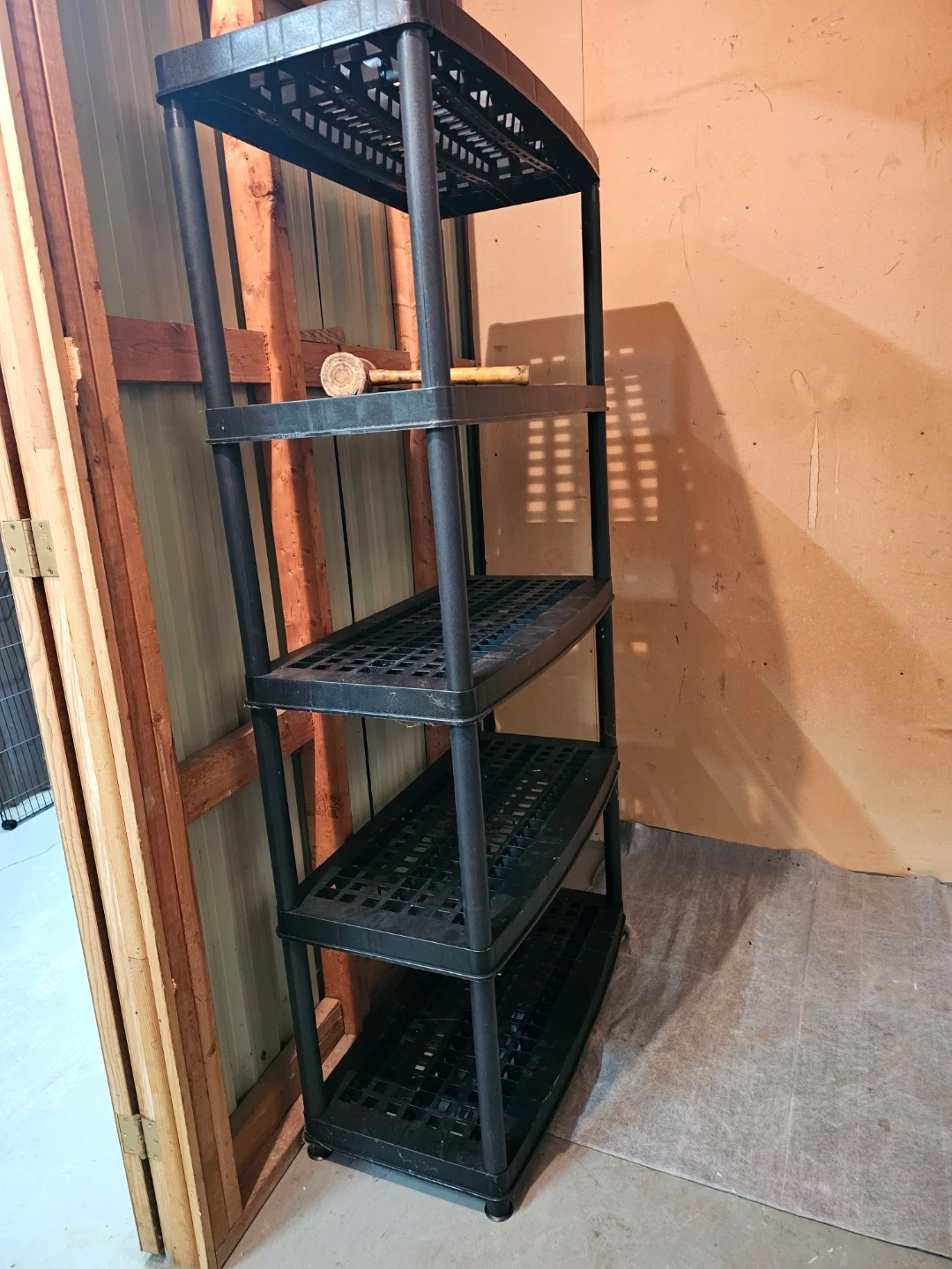 This is a black metal wire shelving unit, perfect for organizing your garage or storage space. It's made of durable metal wire and includes multiple shelves and support poles for assembly.