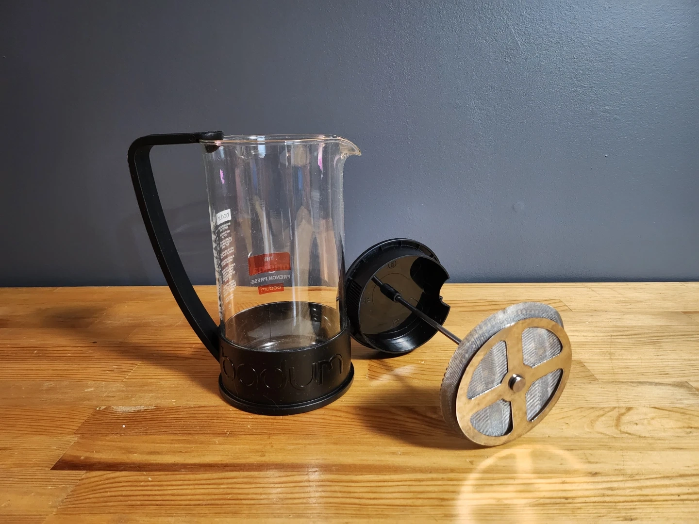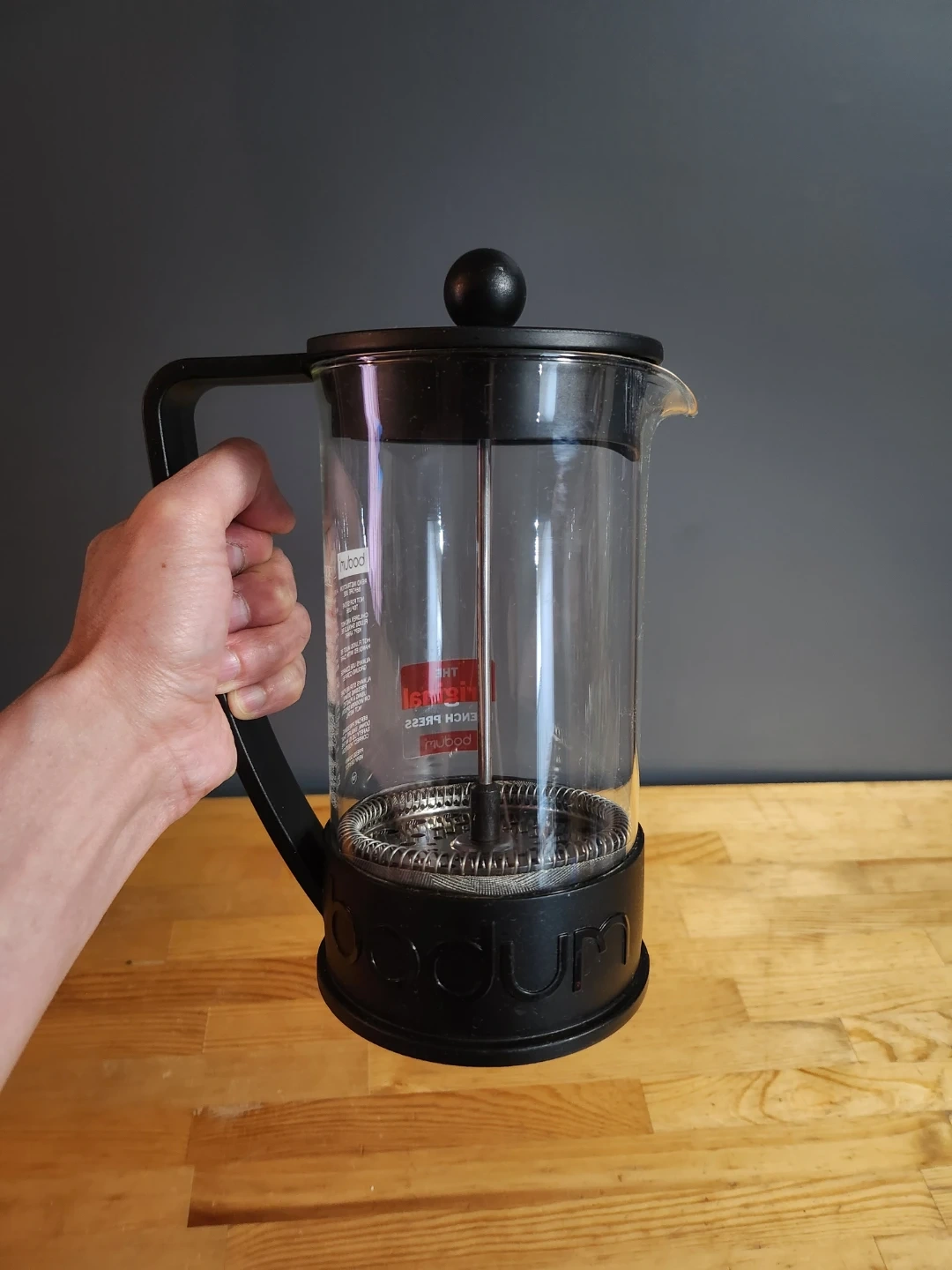 Bodum Brazil French Press coffee maker. It is an iconic and affordable French press model that has been produced since the 1980s.