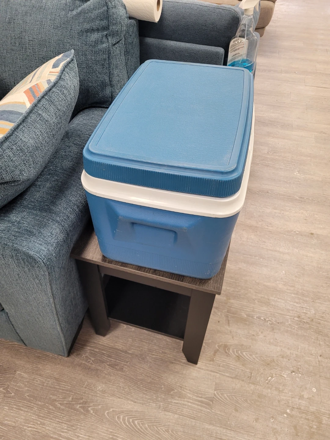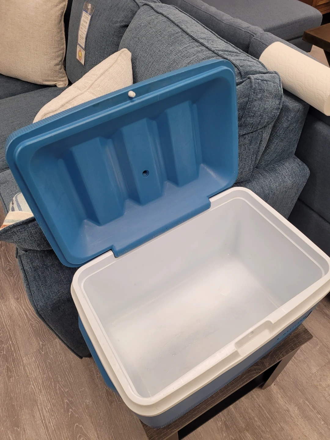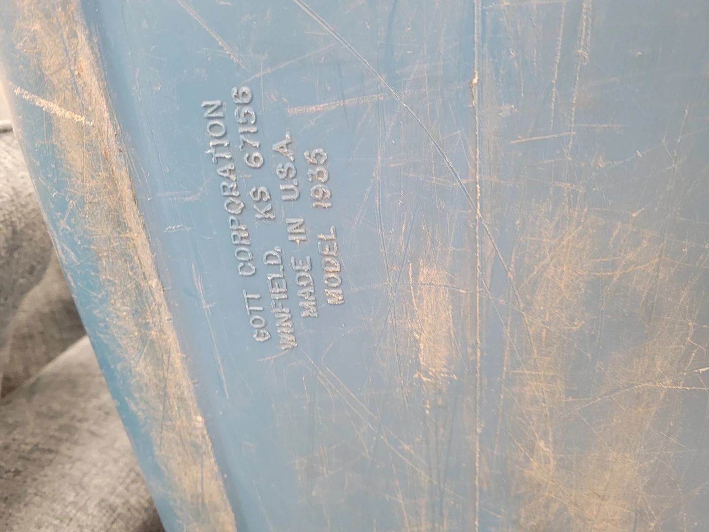 Classic blue Gott cooler with white trim. Made in the U.S.A. This cooler is perfect for camping trips or backyard BBQs. It's made of durable plastic and has a handle for easy carrying. 21 inches across by 14 inches high and 14 inches deep
