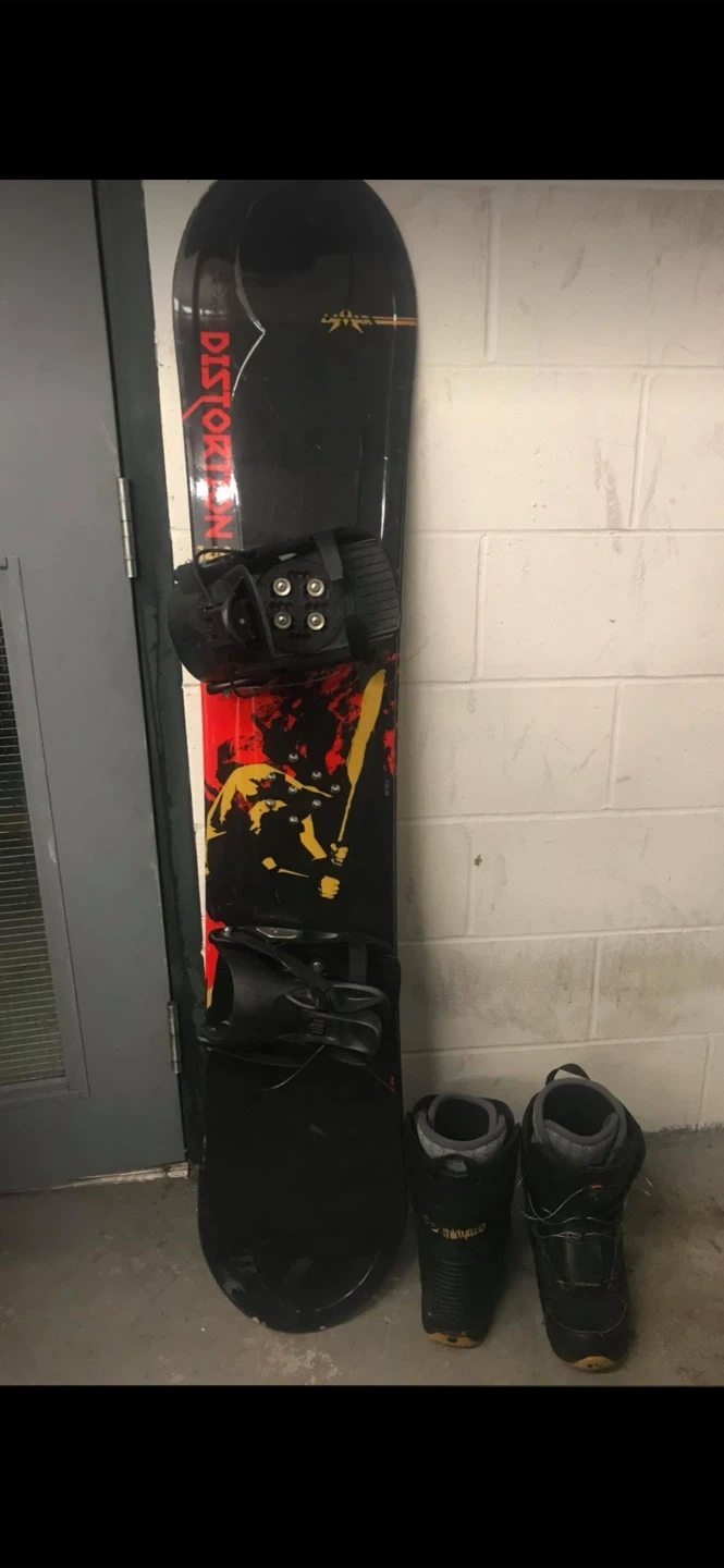 This is gently used Distort snowboard with bindings and boots size 9. The board is black with red and yellow graphics. Boots are black and grey. Perfect for hitting the slopes this winter!