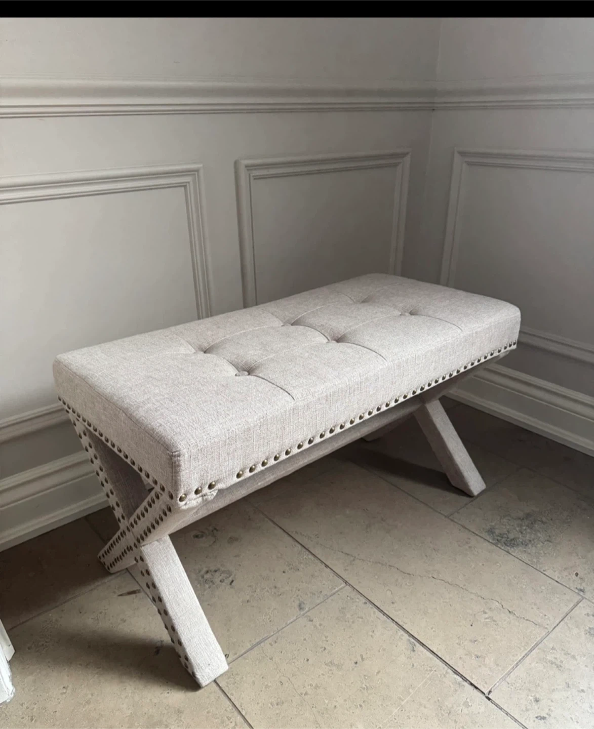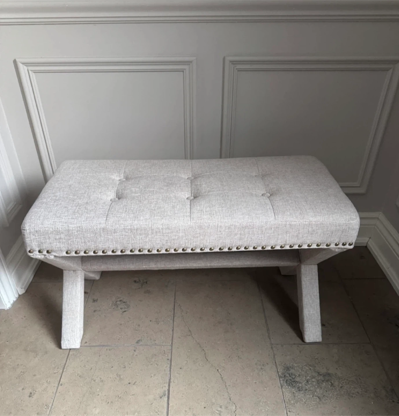 This bench features a tufted upholstered seat and decorative nailhead trim along the base. It has a unique X-shaped leg design.