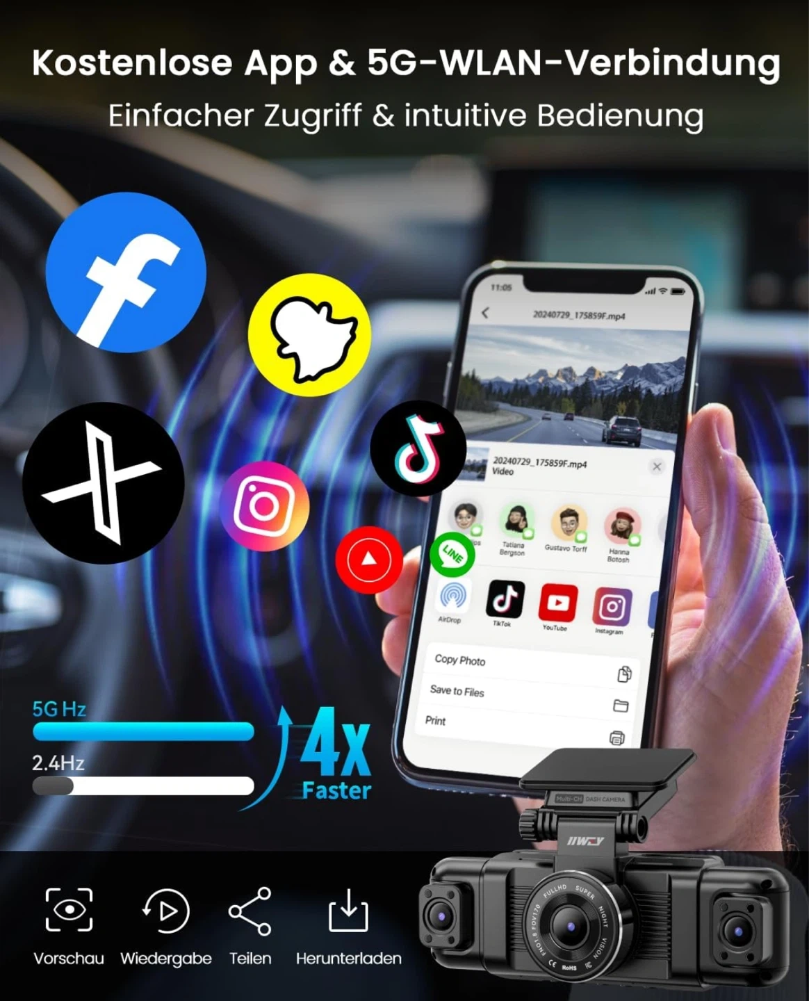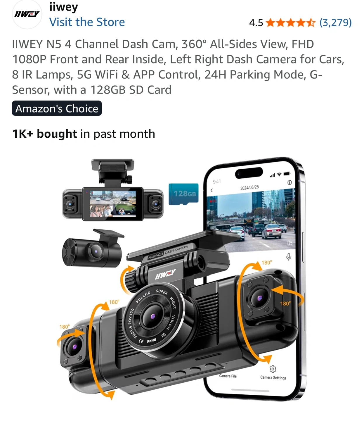 This is the IIWEY N5 4-channel dash cam, offering FHD 1080P resolution for front, rear, left, and right cameras. It includes a 128GB SD card for ample storage. Features like 5G Wi-Fi, app control, and a 24-hour parking mode enhance its functionality. The dash cam also boasts excellent night vision with WDR and 8 infrared LEDs.