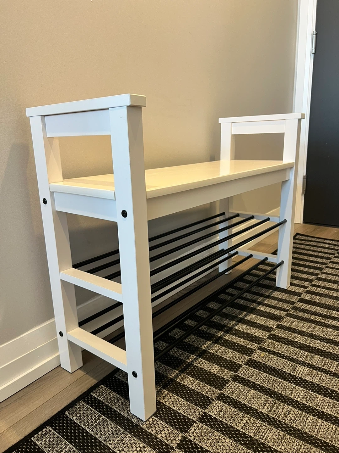 Double Function: Sturdy bench to sit on while putting on shoes + storage for up to 8 pairs.