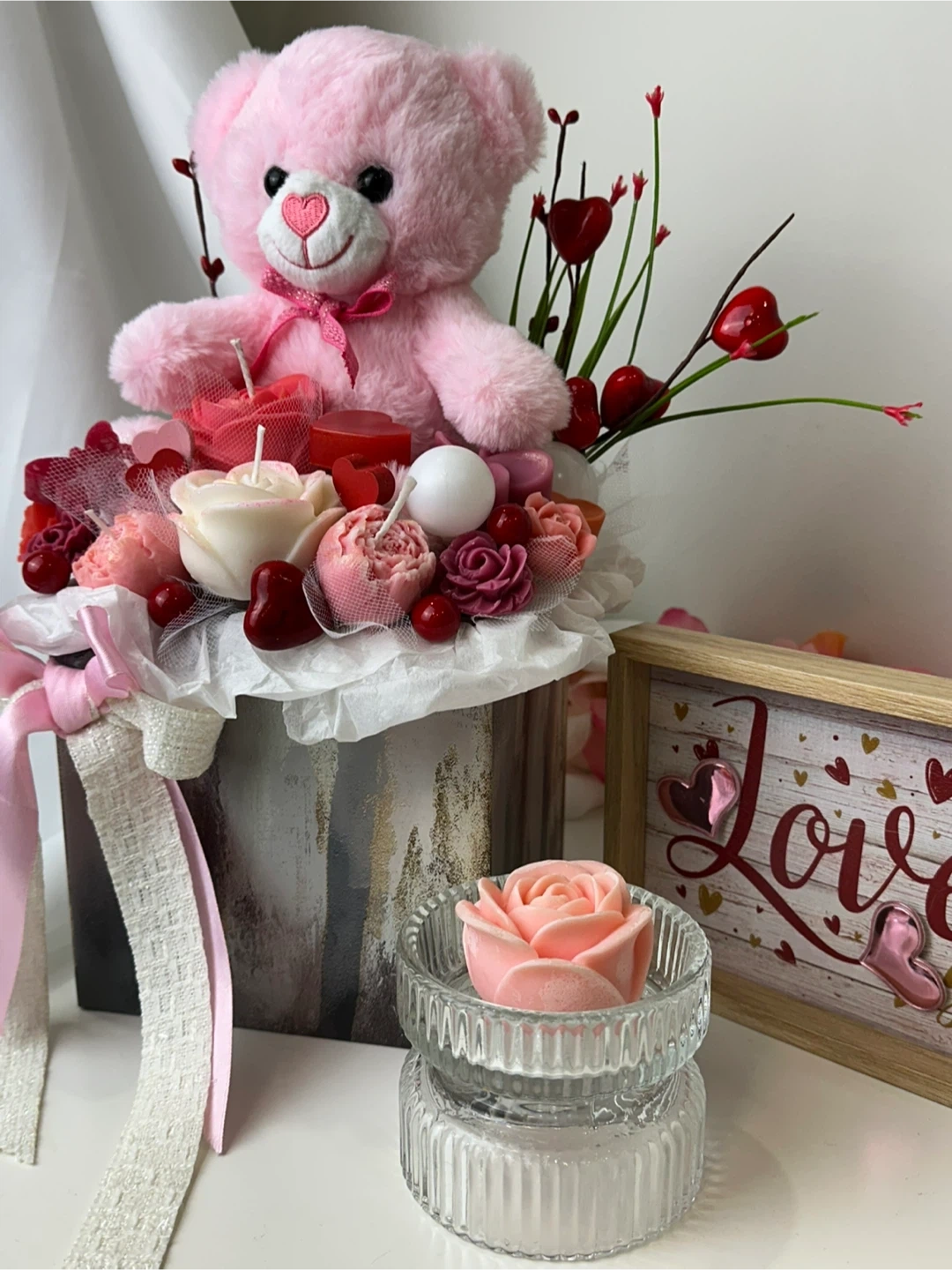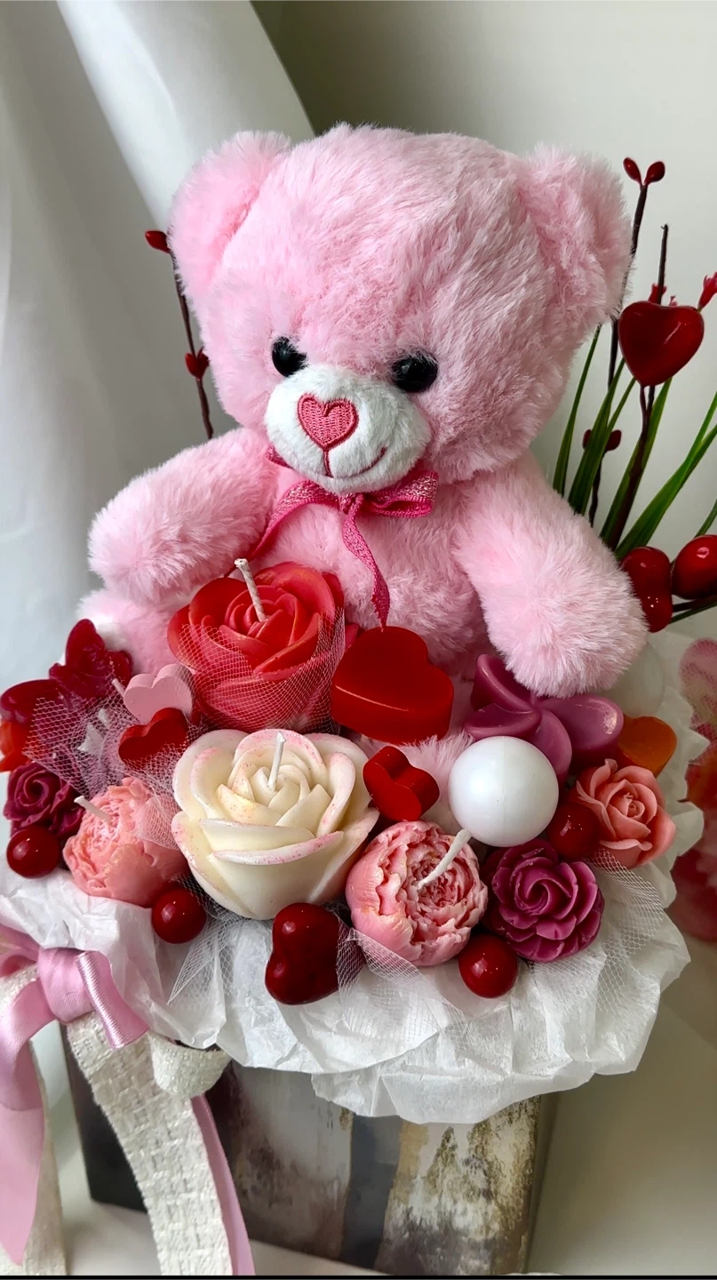 A bouquet of decorative candles in the shape of flowers and hearts with a cute pink teddy bear.