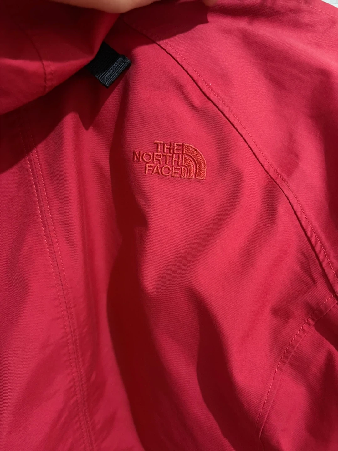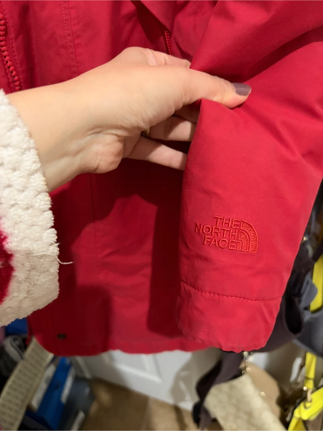 Warm red parka jacket from The North Face. It's insulated for cold weather and features a detachable fur-lined hood. Plenty of pockets for storage.