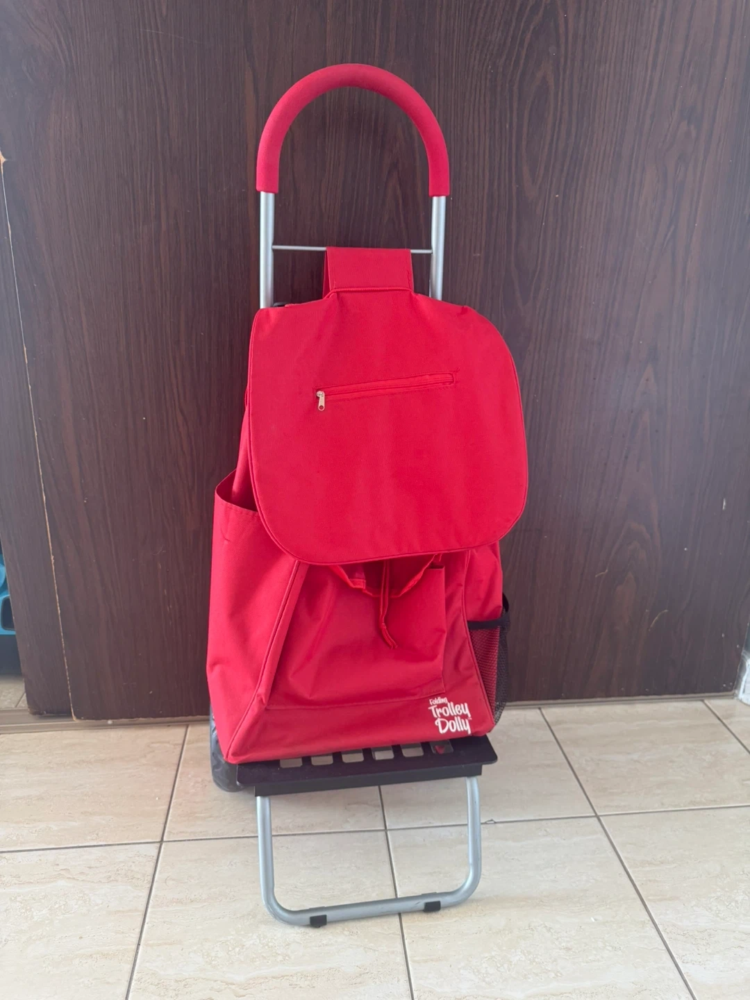 Selling Trolley Dolly Red Shopping Grocery Foldable Cart — brand new, never used. Lightweight yet sturdy design with smooth-rolling wheels, foldable frame for easy storage, and spacious bag with multiple compartments. Ideal for groceries, laundry, shopping, or daily errands.